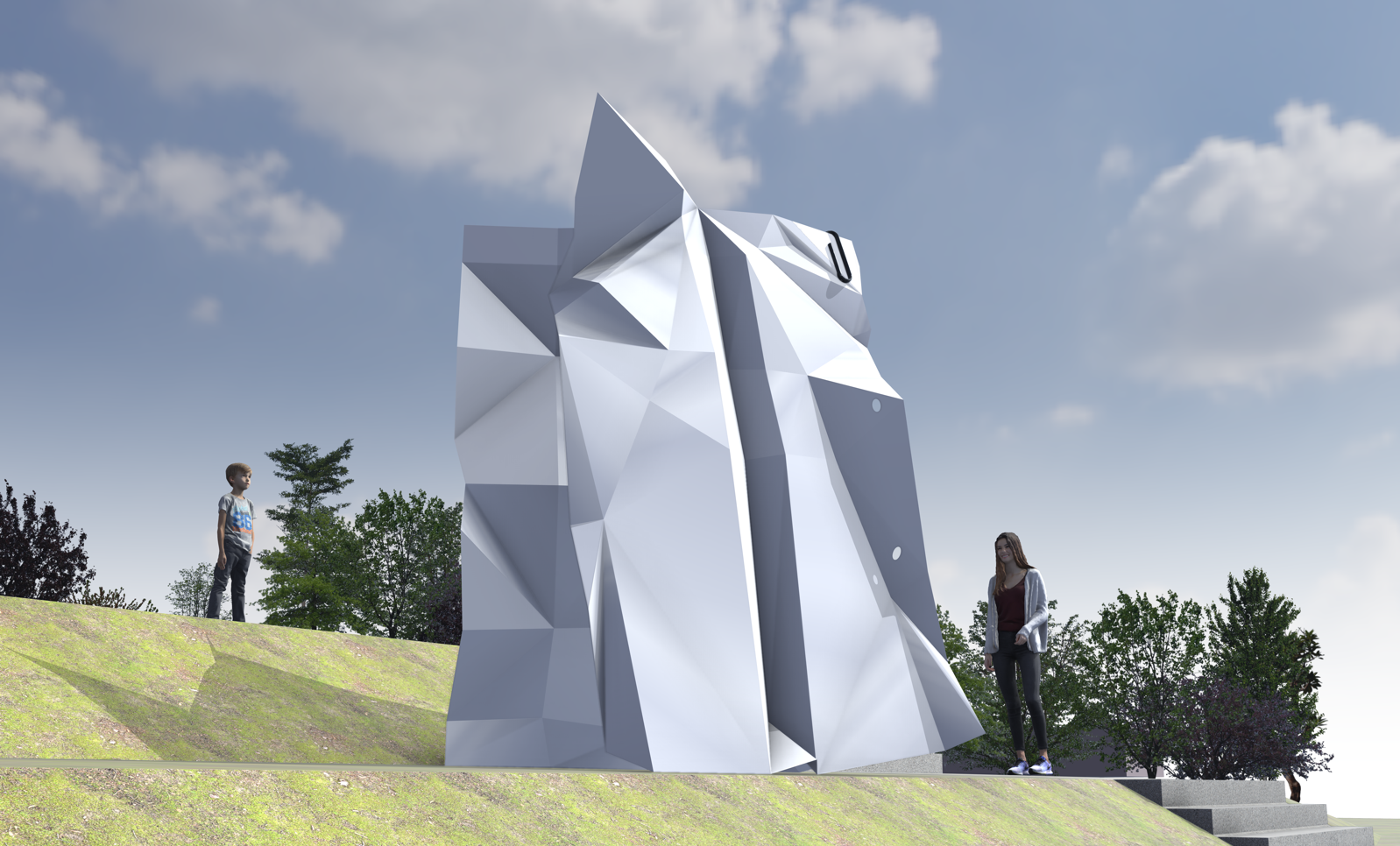Der Entwurf für das Begegnungszentrum und Bürgerhaus in Mainz-Lechenberg zeigt drei vergrößerte, entfaltete Papierblätter aus Edelstahl, deren Faltmuster auf Kiste, Boot und Flieger zurückzuführen sind – Sinnbilder für Bewegung, Wandel und Erkenntnis. Eine übergroße Büroklammer verbindet die Blätter zu einem Ensemble, das für Zusammenhalt und Kommunikation zwischen den Generationen sowie für den Verwaltungsapparat im Gebäude steht. Die Arbeit reflektiert das Falten als Prinzip von Raum, Gemeinschaft und Entfaltung. |