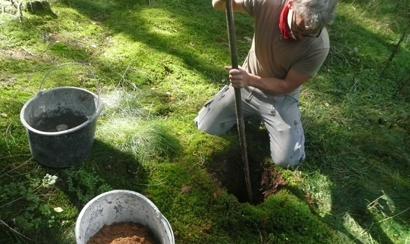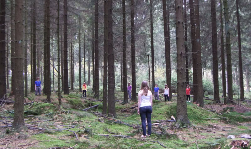 Performance für Stereoskopie. Die Tänzerin und Choreografin Anne-Mareike Hess macht die Räumlichkeit eines imaginären Körpers erfahrbar. Ein rätselhafte viereckige Vertiefung im Waldboden diente als Begrenzung für Ihre Arbeit.