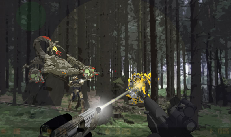 Der Betrachter wird Teil einer wilden Schießerei und bekommt am Ende ein Fadenkreuz vor die Augen und selbst eine "Knarre" in die Hand gedrückt. Mit jedem Bild verwandelt sich der Wald in eine Umgebung, die an Computer-Baller-Spiele wie "Cuonter Strike" erinnert.