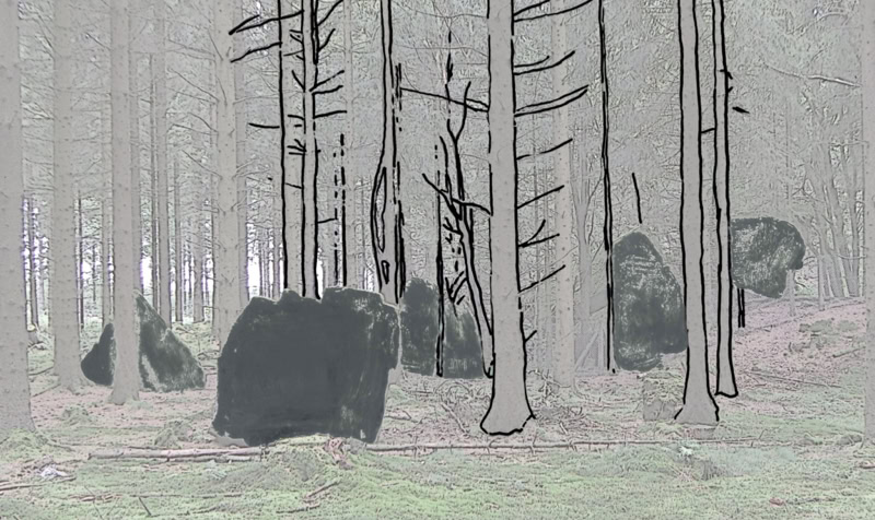 Malerei für Stereoskopie. Tanja Mosblech nutzt zeichnerische und malreiche Mittel um die Strukturen und Räumlichkeit des Ortes Bild für Bild auf Linien und schließlich Flächen zu reduzieren. Im Stereobetrachter wirkt das an sich zweidimensionale Medium trotzdem räumlich.