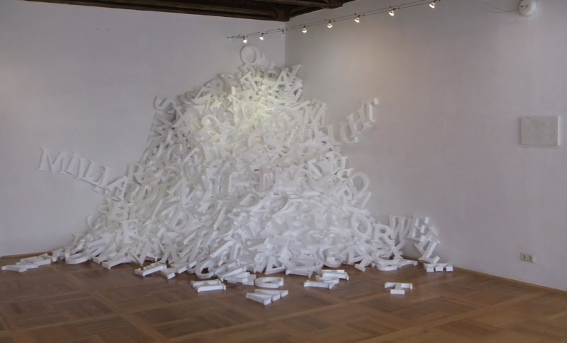 Wird der Raum nun durch hunderte von weißen Buchstaben verdrängt, ist dies zunächst auch eine ungewohnte Ansicht. Buchstaben die uns in Ihrer Schriftart an Lettern der Zeitungspresse erinnern, stapeln sich bis fast unter die Decke, bilden Worte und Wortfetzen, fließen an der Wand und auf dem Boden weiter und scheinen sich auch auf den Außenraum zu ergießen, glaubt man dem Blick durch das Fernglas am Fenster. Eine Flut von Buchstaben, Worten und Wortfetzen, die den gewohnten Lebensraum verdrängt, sich ausbreitet und in ihrer Konsequenz ebenso bedrohlich wird, wie ausuferndes Wasser.
