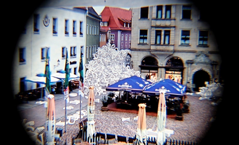 Bei der Flut von 2013 in Meißen, verdrängte Wasser den gewohnten Lebensraum. Straßen und Plätze verschwanden unter einer braunen Suppe. Was passiert, wenn man diese Verdrängung weiterspinnt oder wie sieht es aus, wenn die gewohnte Umgebung durch ein anders Material als dem des Wassers eingenommen wird. Die Bilder des Zyklus Meißen Apokalypse zeigen uns diese Szenarien, die neben der bloßen Präsentation der veränderten Räumlichkeit automatisch den Klimawandel und zunehmende Naturkatastrophen thematisieren.