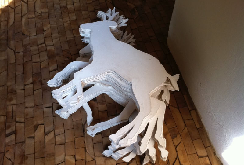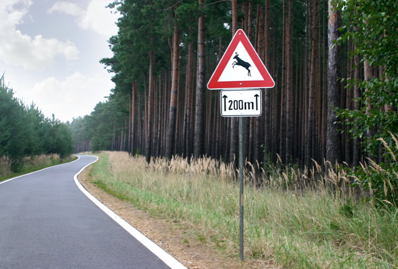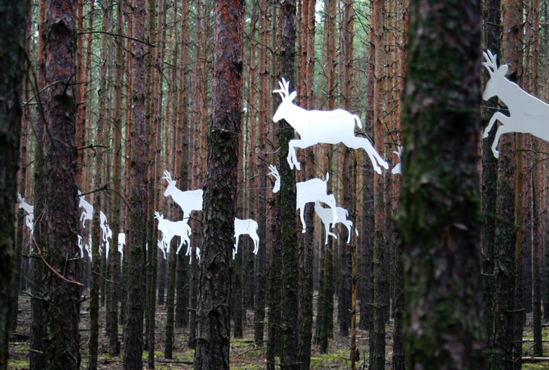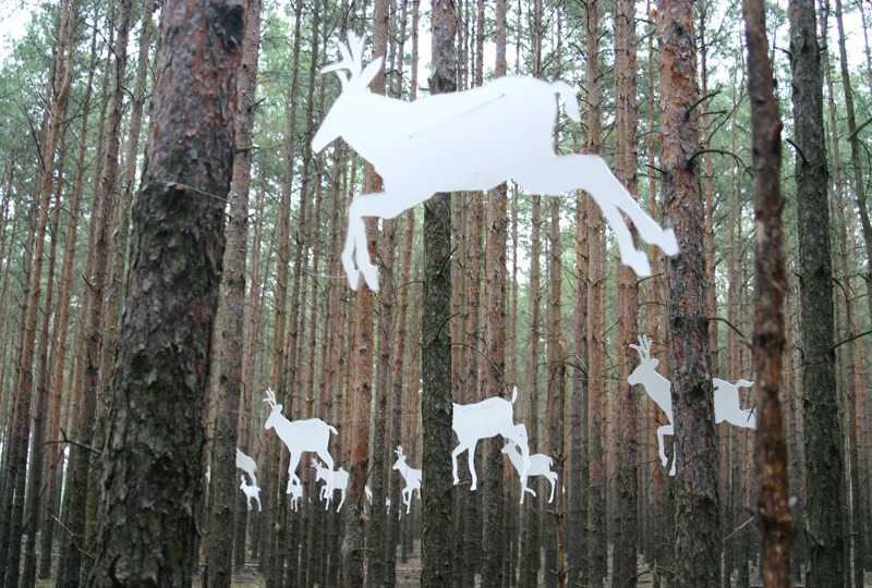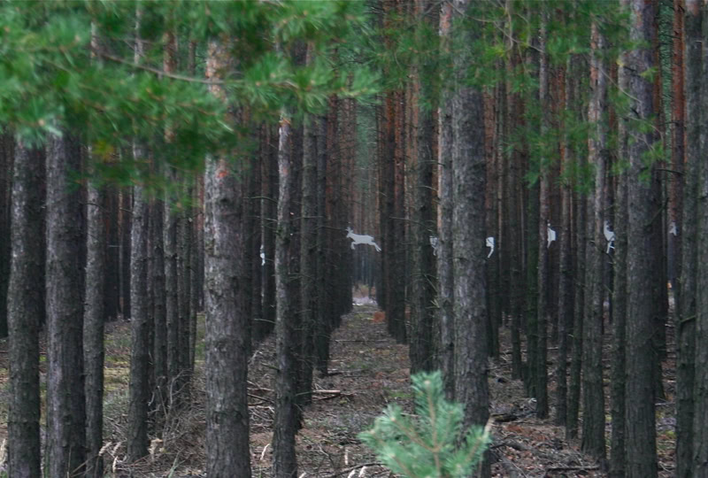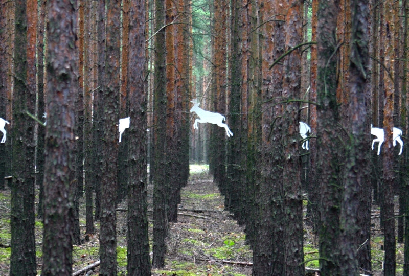 Mehrere innerhalb dieser Baumreihen positionierte und in einzelne Frames aufgeteilte Silhouette eines weißen Hirsches ziehen sich zu bewegten Bildern einer kurzen Filmsequenz zusammen wenn ein Radfahrer diese Wegstecke passiert. In Abhängigkeit von der Fahrgeschwindigkeit des Passanten wird dieser einen mehr oder weniger schnell durch den Wald galoppierenden weißen Hirsch sehen.Bei einer Fahrgeschwindigkeit von 20 km/h (was ungefähr der Durchschnittsgeschwindigkeit eines Radfahrers entspricht) werden 5,5 Einzelbilder pro Sekunde sichtbar. Der „Film“ wird bei dieser Geschwindigkeit also noch leicht ruckeln. Um eine ruckelfreie Filmsequenz zu erleben, was bei 12 Bildern pro Sekunde der Fall sein sollte, benötigt man eine Geschwindigkeit von 43,2 km/h. Für die Besucherinnen und Besucher bleibt die Aufgabe, die optimale Geschwindigkeit für das Betrachten des „Films“ herauszufinden, ohne dem weit verbreiteten „Bambi-Irrtum“ zu verfallen.