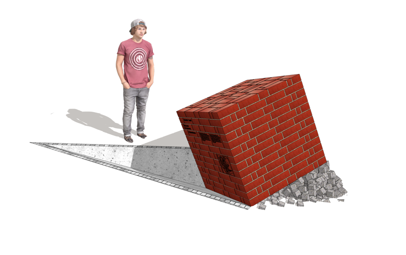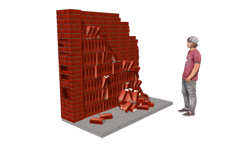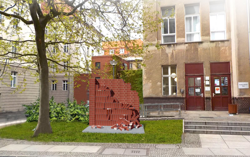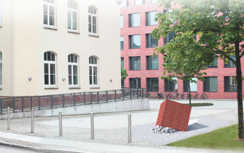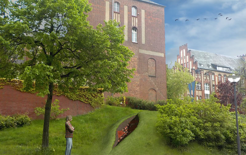 Da die geplanten GeDenkOrte sich immer auf einen konkreten Ereignisort auf dem Gelände der Charité, mit seiner historisch geprägten Umgebung beziehen, folgt das Gesamtkonzept den vorgefundenen räumlichen und (landschafts-) architektonischen Strukturen, Gegebenheiten und Materialien. So ist das Gelände der Charité vor allem durch die Gebäude des frühen 20. Jahrhunderts bestimmt, deren Baumaterial, dem roten Backstein, auch heute noch überwiegende Teile des Campus prägen. Dementsprechend werden alle GeDenkOrte zur Wiedererkennung komplett oder teilweise aus die- sem Material aufgebaut und erhalten bruchstückhaft Fragmente der für diese Umgebung so typischen Mauerfassade aus diesen rotbraunen Klinkern.