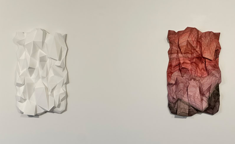 The CRASH series, consisting of three works, manifests itself in interlaced and disjointed triangular formations made of and on paper, which at times actually reach into the space, at times detail the spatial through graphic overpainting and add a further mapping, as in a virtual environment, or allow it to exist as an illusion on the two-dimensionality of the sheet.