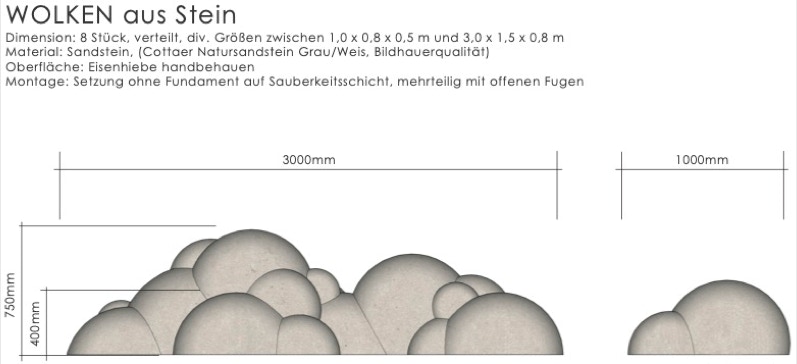 Haufenwolken aus grau-weißem Sandstein unterschiedlicher Größe und Gestalt verteilen sich scheinbar zufällig auf der Wettbewerbsfläche und schaffen in Verbindung mit einer lockeren Bepflanzung Inseln zum Verweilen und Innehalten. Zu dem auf dem Südfriedhof in Architektur und Grabmalgestaltung vielfach existierendem Naturstein stellt das verwendete Material einen angemessenen Bezug her. Die rundgewölbten Sandsteinoberflächen mit ihrer natürlich angenehmen Haptik laden dazu ein, sich niederzulassen oder daran anzulehnen.