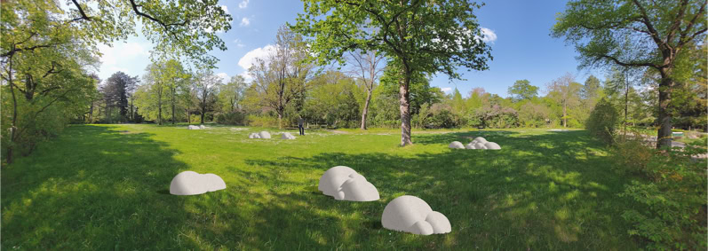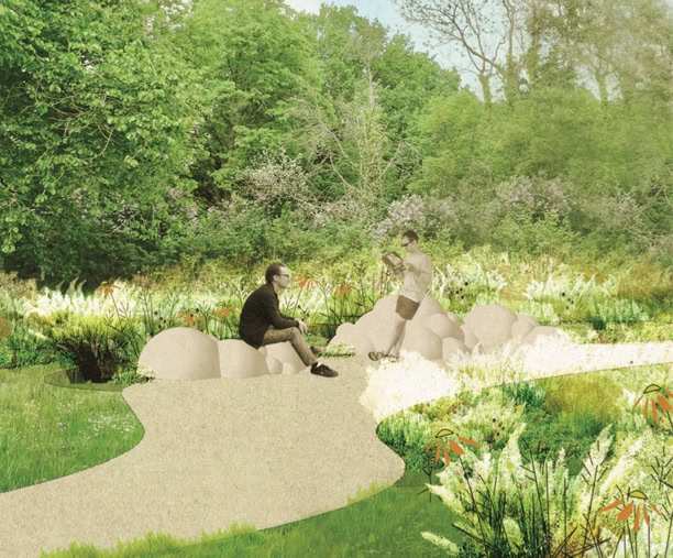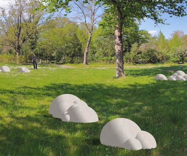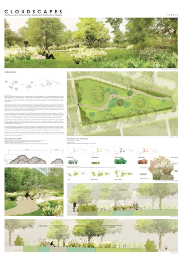 Cumulus clouds of grey-white sandstone of different sizes and shapes appear to be randomly distributed across the competition area and, combined with loose planting, create islands to linger and pause for a moment. The material used creates an appropriate reference to the natural stone that often exists in architecture and tomb design in the southern cemetery. The rounded sandstone surfaces with their naturally pleasant feel invite you to sit down or lean on them.Impression.