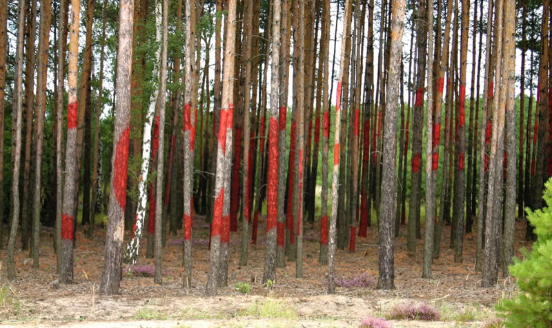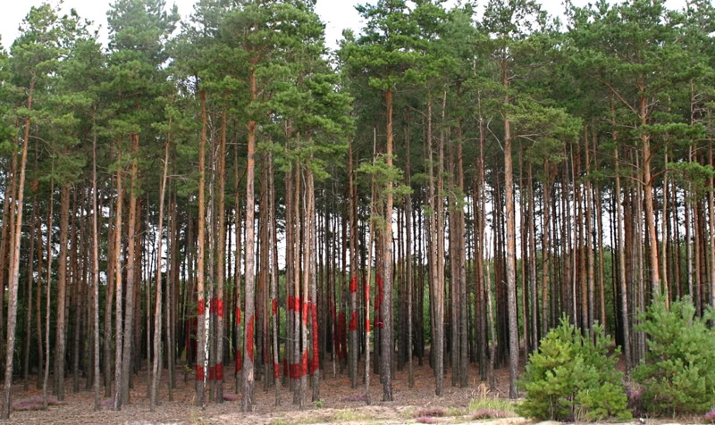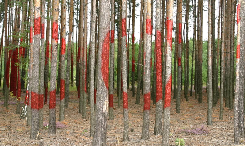 red paint on pine trunks, 50 x 60 x 100 m, transNATURALE 2007