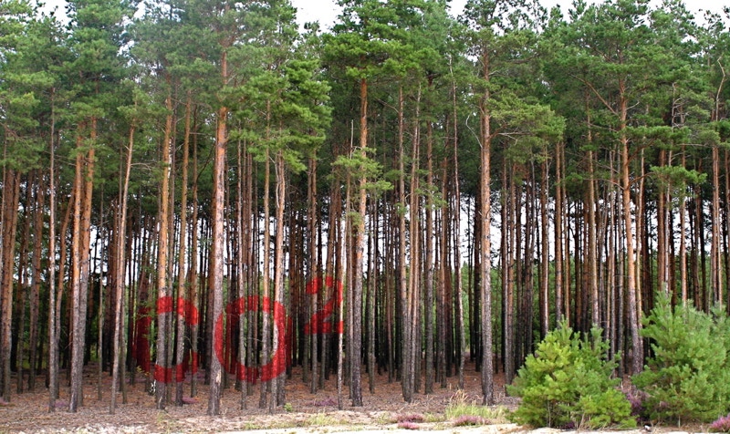 Das mit rotem Lack auf die Stämme gesprayte CO2 – Zeichen präsentiert sich in seiner exakten Form nur vom Projektionspunkt aus und verschwimmt, wenn man sich von diesem entfernt, bis sich nur noch abstrakte Farbflächen abbilden. Wenn sich die poröse Rinde der Kiefern wieder erneuert, werden nach ein paar Jahren kaum noch Spuren der Bemalung zu sehen sein. Das dahinter befindliche Braunkohlekraftwerk wird bis dahin unzählige Tonnen des Treibhausgases ausgestoßen haben.