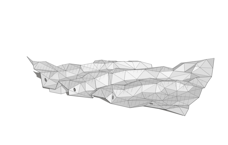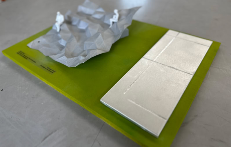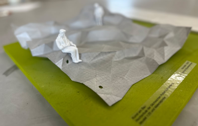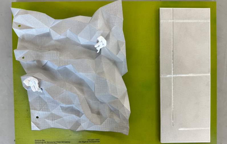 Nested triangles join together to form a folded rectangle, the basic shape of which is reminiscent of a crumpled sheet of paper. Four circular holes at the edge of the sculpture and a square network of lines suggest the enlarged representation of a squared, perforated A4 sheet of paper and evoke the image of a record that has been put on paper and discarded in a laissez-faire educational environment. DAS FLIEGENDE KLASSENZMMER, as the title suggests, forms the structure of an outdoor learning area divided into rows of seats. The title, borrowed from Erich Kästner's school novel of the same name, draws parallels to everyday school life, which, similar to the novel, is able to show (conflict) solutions in joint learning through a change of perspective. The poetic image of a floating sheet of paper represents the transfer and dissemination of information that takes place at this location: snatched through the open window of a classroom by a gust of wind that is characteristic of the altitude of the location, the paper sinks to the floor elsewhere to present its contents and carry them on.