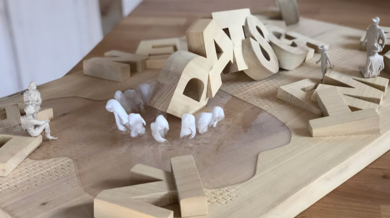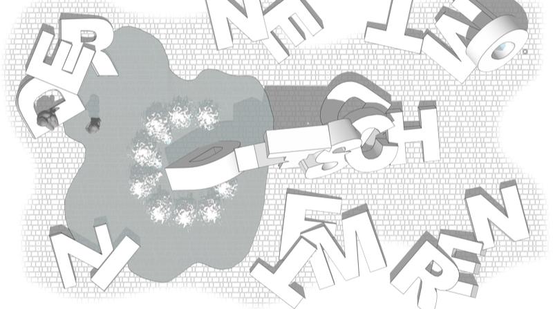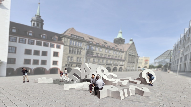 Alle 23 Buchstaben des Chemnitzer Slogan: „CHEMNITZ - STADT DER MODERNE“, aus glattem, hellen Sichtbeton, gruppieren sich chaotisch durcheinandergewürfelt um eine Wasserpfütze. Ein Teil dieser Buchstaben formiert sich zu einer deutlich erkennbaren neuen Ordnung: „DATSCH“. Dieser Schriftzug übernimmt die Funktion der dreidimensionalen Darstellung und Vergegenwärtigung eines Geräusches, welches mit einem ins Wasser fallenden oder klatschenden Objekt einhergeht.