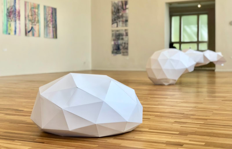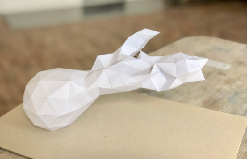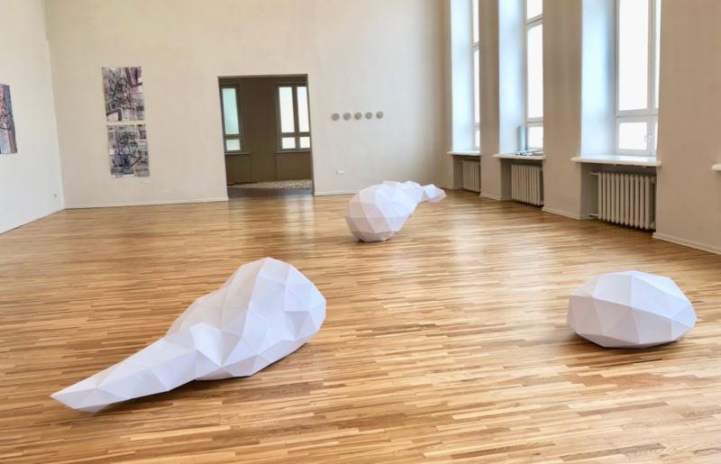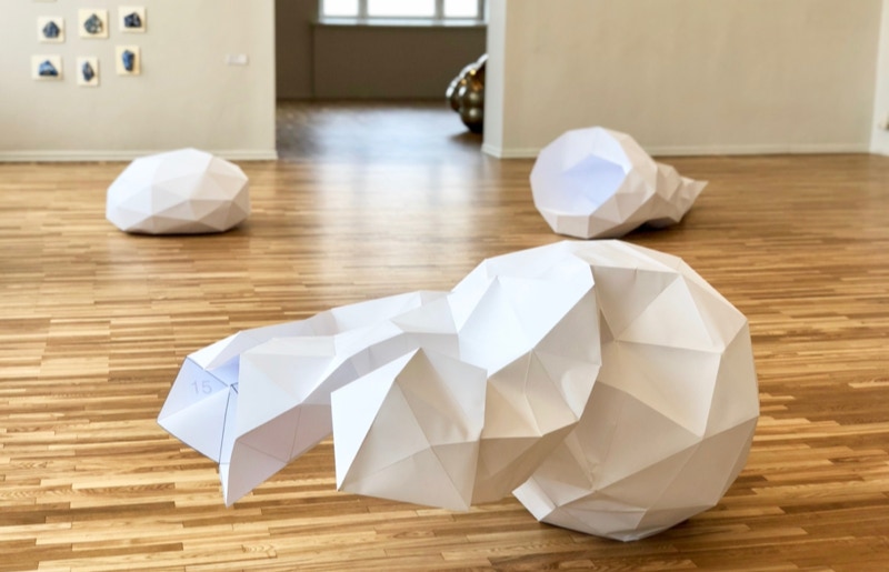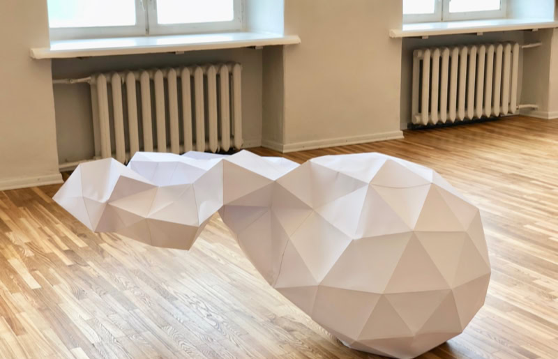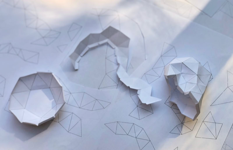 When a sculptor models a sculpture, there is often a lump of clay at the beginning that is gradually shaped into the desired form. Accordingly, in virtual 3D programmes, objects are modelled from a sphere. Entgleister Deltaeder 01-03 shows three objects modelled virtually at low resolution whose starting point was a sphere or a deltahedron. The objects, constructed from paper, represent various possibilities of spatial modification and deformation from their starting point. They show traces of virtual processing which were transferred into real space by transforming the geometric and cutting patterns of the objects.