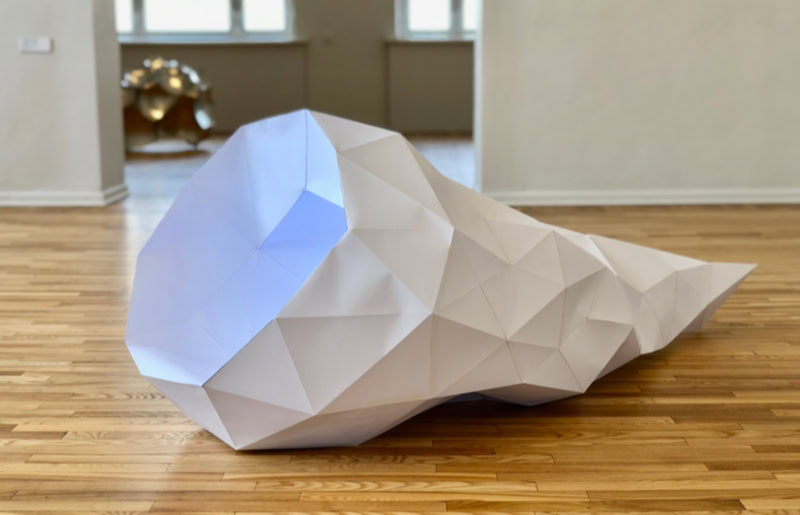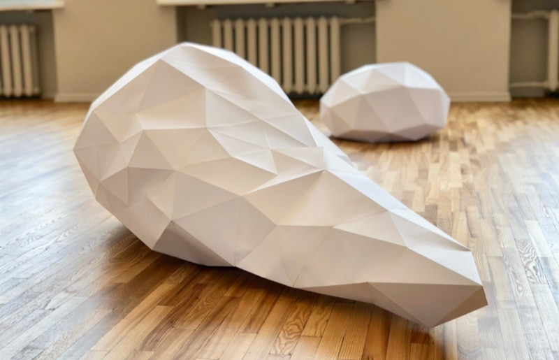 Modellierte ein Bildhauer eine Plastik, so stand zu beginn oft ein Klumpen aus Ton, welcher nach und nach in eine gewünschte Form gebracht wurde. Dem entsprechend werden in virtuellen 3D-Programmen, Objekte aus einer Kugel heraus modelliert. Entgleister Deltaeder 01-03 zeigt drei mit geringer Auflösung virtuell modellierte Objekte, deren Ausgangspunkt eine Kugel, bzw. ein Deltaeder war. Die aus Papier aufgebauten Objekte bilden verschiedene Möglichkeiten einer räumlichen Modifikation und Deformation ihres Ausgangskörpers. Sie weisen Spuren einer virtuellen Bearbeitung auf, welche über die Verarbeitung der geometrischen Abwicklungen und Schnittmuster der Körper, in den realen Raum übertragen wurden.