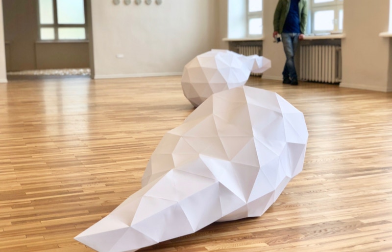 Over time, more and more impressions and traces from the real environment surrounding the paper, caused by transport, humidity or dirt, appear on its fragile, thin, white, space-defining surfaces. They thus reflect the discrepancy between this world and the "clean" exactness of the virtual counterpart from which they originate.