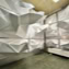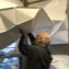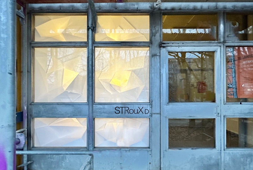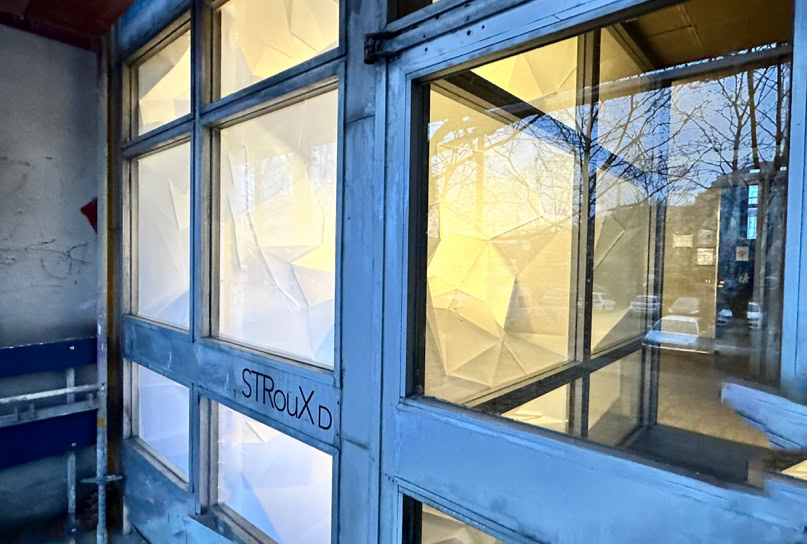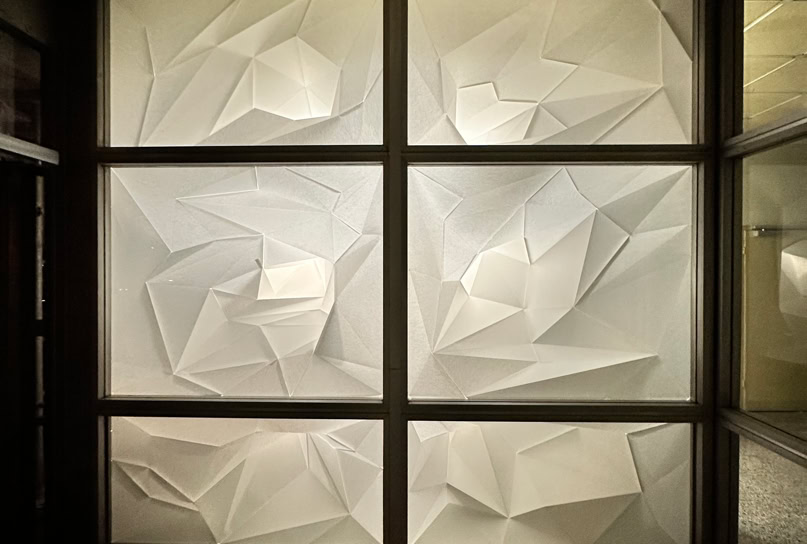 Der Begriff „DURCHWEG“ umfasst Bedeutungen wie Einheitlichkeit, Konsequenz und Durchgängigkeit, verweist aber auch auf Übergänge, Verbindungen und gerichtete Bewegungen. Geometrisch geformte Papierskulpturen stecken sich in die Pförtnerloge und reagieren auf die formale Strenge des architektonischen Rasters. Die aus dreieckigen Flächen zusammengesetzte Struktur spielt mit den Grenzen des Raumes, dem was konstruktiv machbar ist und verbindet statische Präzision mit einer fließenden, dynamischen Ästhetik.