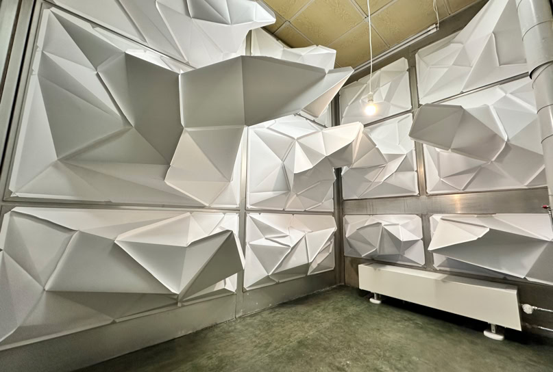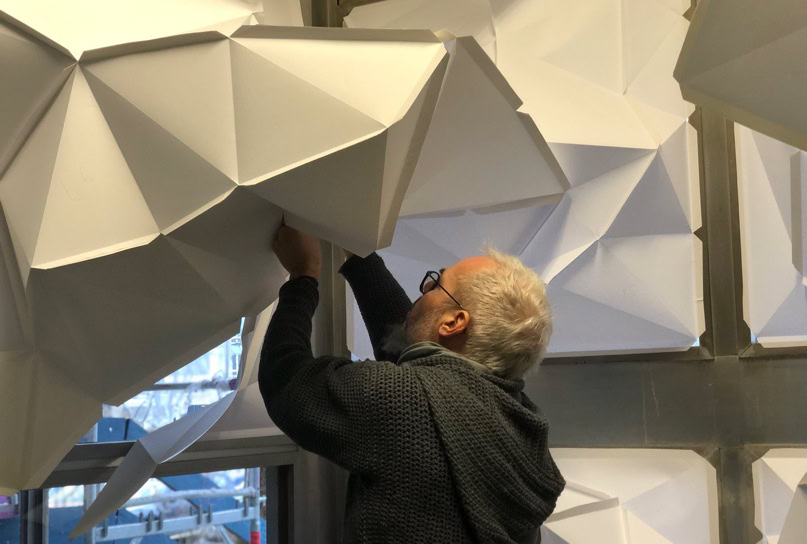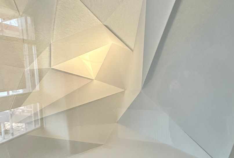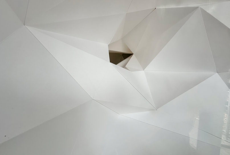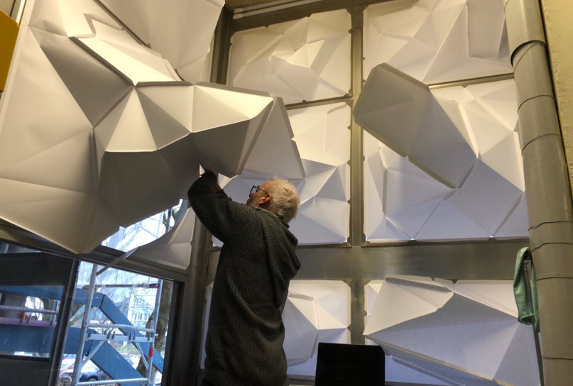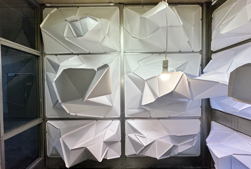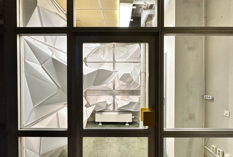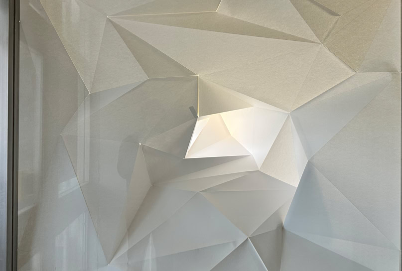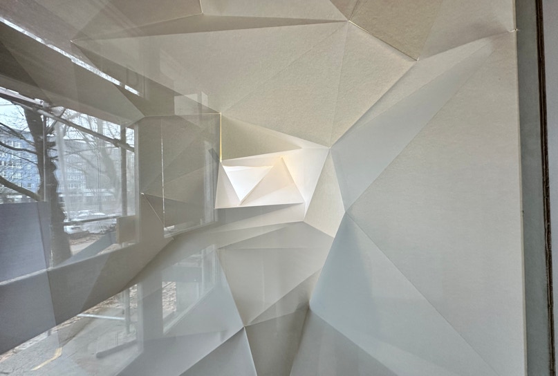 The term “DURCHWEG” encompasses meanings such as uniformity, consistency and continuity, but also refers to transitions, connections and directed movements. Geometrically shaped paper sculptures are inserted into the porter's lodge and respond to the formal rigor of the architectural grid. The structure, composed of triangular surfaces, plays with the limits of the space, with what is constructively feasible and combines static precision with a flowing, dynamic aesthetic.