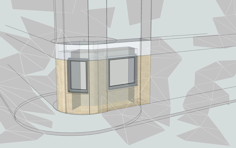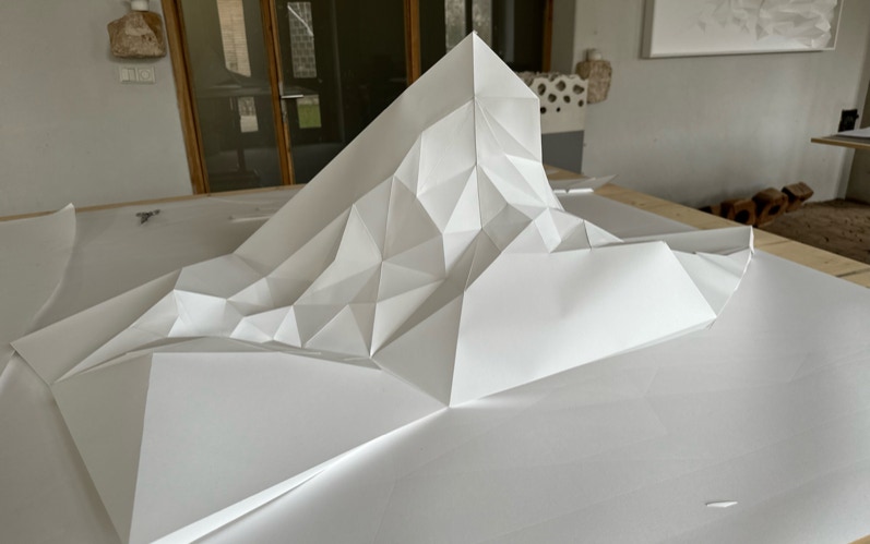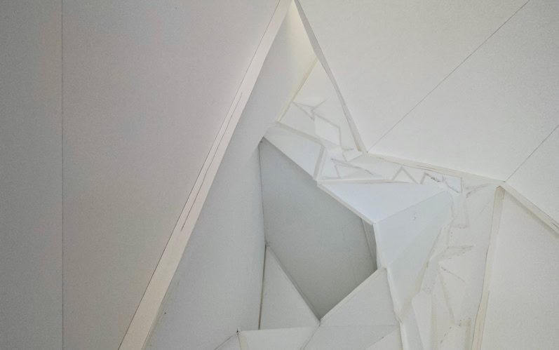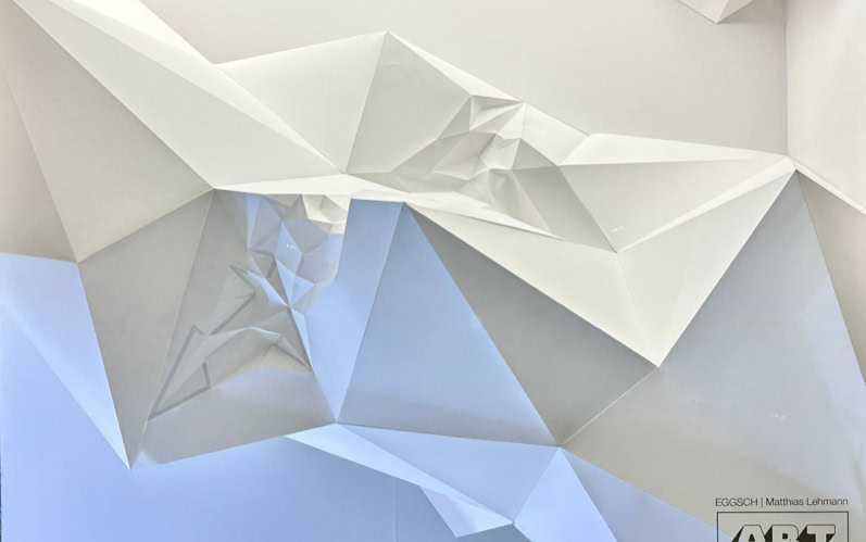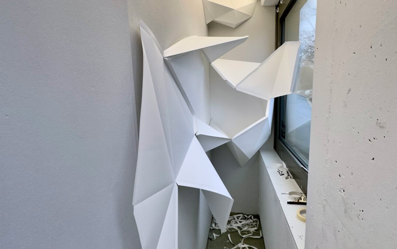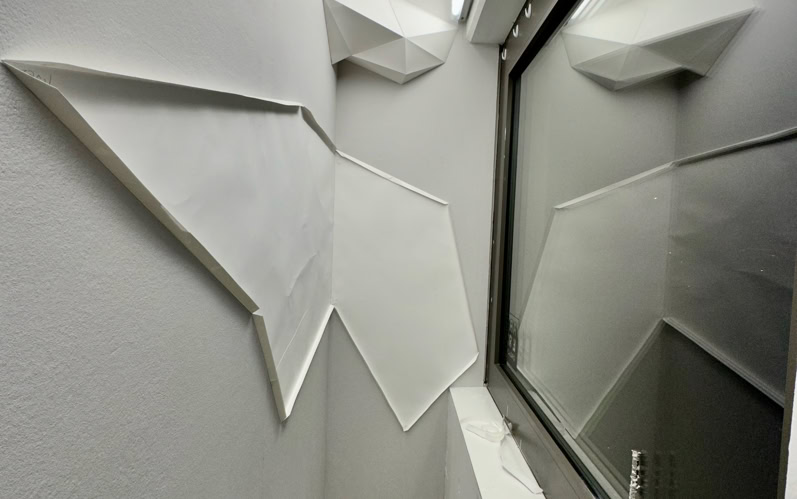 For this exhibition niche, which is far more than an ordinary shop window, Matthias Lehmann has developed an arrangement of folded paper, bound to the location, which deals with its limitations, absurdity and presence and playfully traces its peculiarities between inside and outside, separation and permeation.