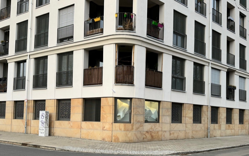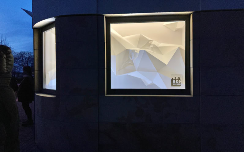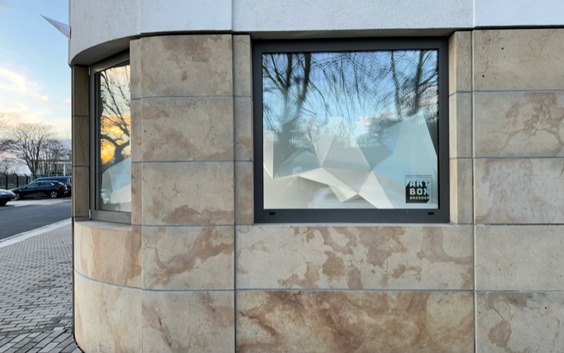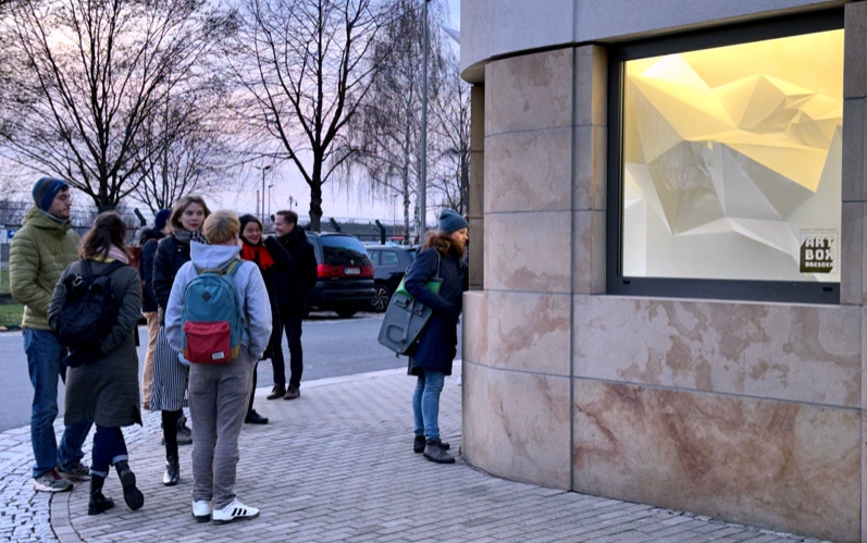 Ein kurioser Raum ohne Zugang, eine runde Ecke - die ARTBOX Dresden. Ihr Ausstellungsraum hat keinerlei Bestimmung für das sie beherbergende Gebäude und besitzt durch seine Lage im Kreuzungsbereich und einem weitgehend unbebauten Gegenüber, architektonisch doch eine repräsentative Funktion.