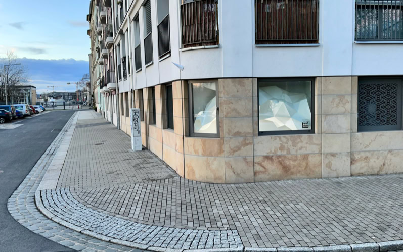 A curious space without an entrance, a round corner - the ARTBOX Dresden. Its exhibition space has no purpose for the building that hosts it and yet, due to its location at an intersection and opposite a largely undeveloped area, it nonetheless plays an architecturally representative role.