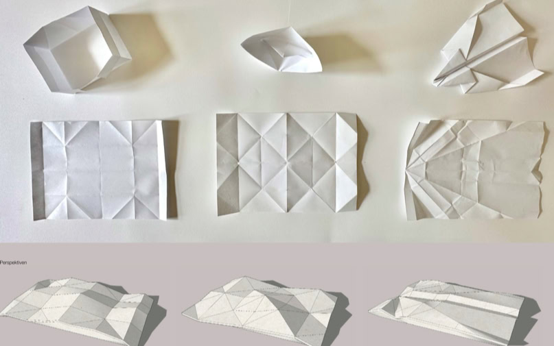 Three folded figures made of paper: a (soap) box, a boat and a plane, which are analogous to movement or transportation possibilities on land, on water and in the air, are unfolded and leave folding patterns on the sheet, which give clues about their original form and shape. This transformation from the two-dimensionality of the surface of a sheet of paper to a spatial object with its specific properties (moving/transporting, floating and flying) and back again provides an insight into the changeability of the things that surround us.
