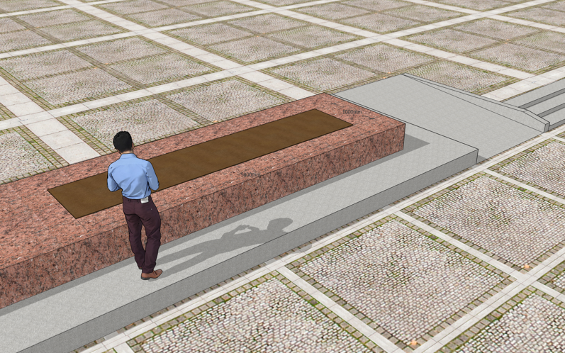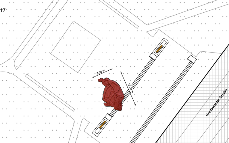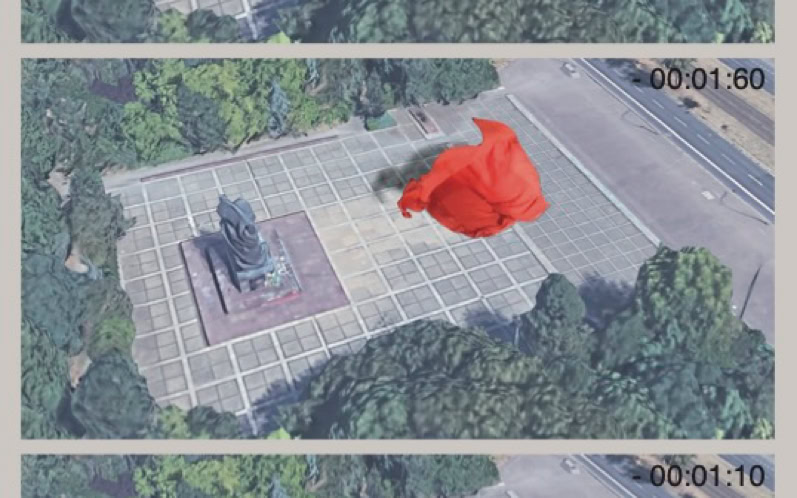 FALLEN FLAG picks up on this symbol and places the folds of a fallen oversized red flag diagonally on the forecourt of the monument. With the fall of this central symbol of GDR and Eastern Bloc history, the artistic commentary addresses the decline of the socialist social order, whose contemporary testimonies - manifested in the appearance of the historical square ensemble - are covered, partially disappearing and thus appear less tangible and present for us , as if under the veil of a bygone age.