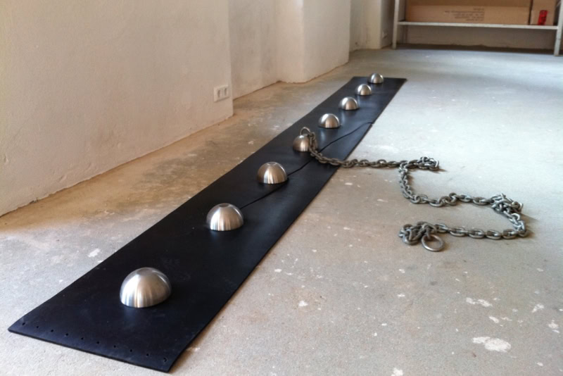 Für die Installation halsband diente einen ganz bestimmter Baum im Schlosspark, der eine merkwürdige Einschnürung im unteren Stammbereich besitzt, die sicher von einer „Veredelung“ in seinen jungen Jahren herrührt. Das überdimensionale Halsband legt sich um diese Verengung und gibt vor der Grund für diese Verformung zu sein.