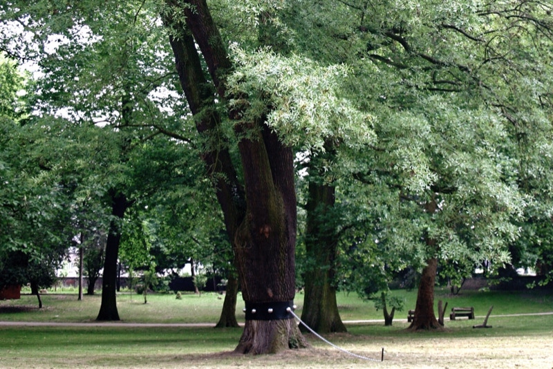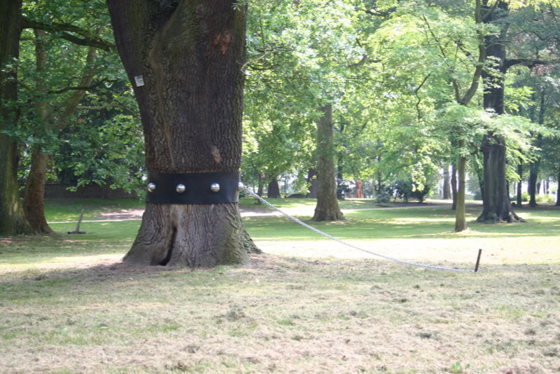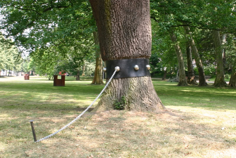 Die Installation impliziert uns, dass es sich nicht um einen gewöhnlichen Baum handelt. Das Halsband, wie wir es von „bissigen“ Comic-Hunden oder aus der Gotic-Szene kennen, kettet allem Anschein nach ein kaum zu bändigendes Wesen an.