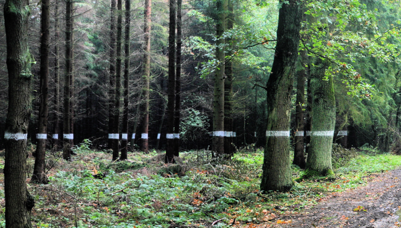 Matthias Lehmann wählt sich den Mittelpunkt seines Wegabschnittes und markiert diesen mit einer Betonplatte, auf der die genauen Längen- und Breitengradangaben sowie die Höhe dieses geographischen Punktes zu lesen sind. Diese Angaben stammen von dem zuvor ermittelten kongruenten Standpunkt bei Google Earth, von welchem er die virtuelle Horizontlinie der 3D-Google-Earht-Oberfläche nimmt und auf den realen Standort in Poggenhagen projiziert. Die Projektion dieser Horizontlinie wird mit weißer Farbe auf die Baumstämme des umgebenden Waldes gemalt. Sie ist nur von dem einen exakten geographischen Punkt aus sichtbar und verschwimmt immer mehr zu einem chaotischen Strichmuster, je weiter man sich davon entfernt.