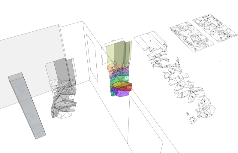 KNIETSCH ist ein polygonales Relief auf der Basis von Dreiecksformen, das durch unregelmäßige Hebungen und Absenkungen von einzelnen Vektoren in einer gerasterten Fläche, die man sich wie ein Netz vorstellen kann, entsteht. Ihre finale Gestalt erhielt die so geformte Reliefstruktur durch das anschließende, von Matthias Lehmann und Lisa Pahlke am Computer durchgeführte, partielle Dehnen und Stauchen, Verschieben und Verdrehen – also durch digitales knietschen. |
