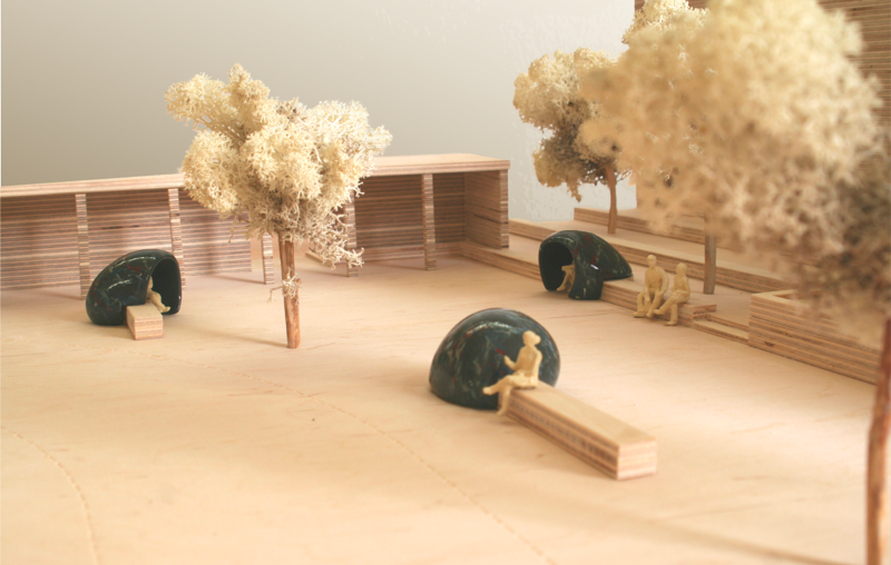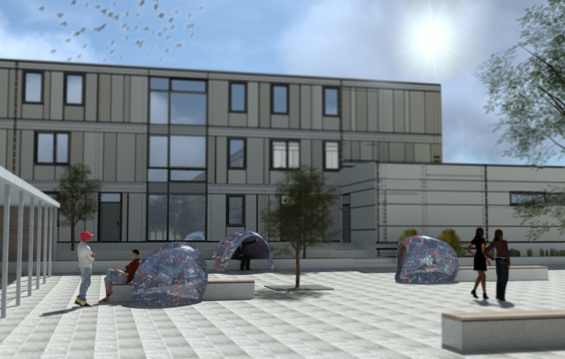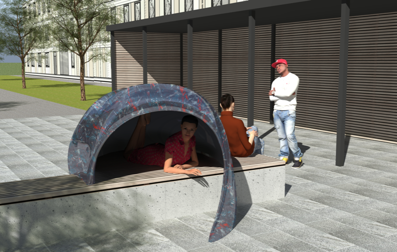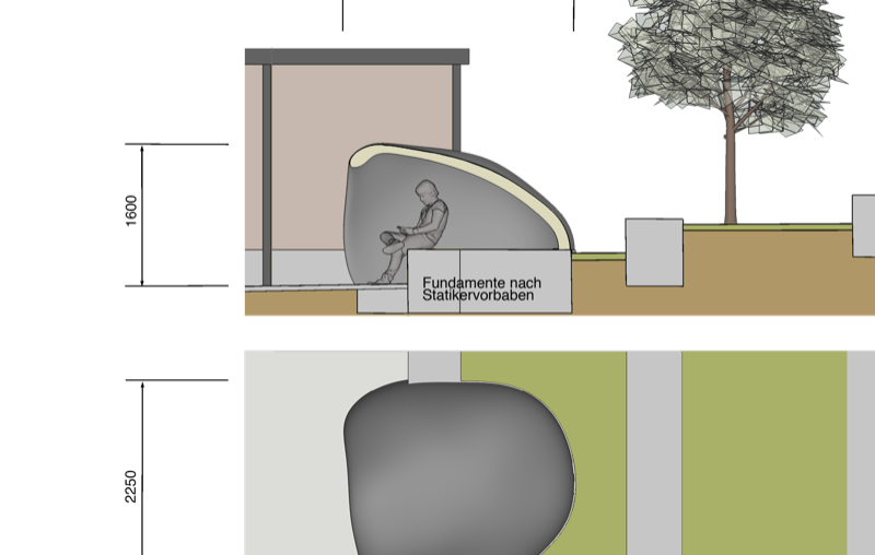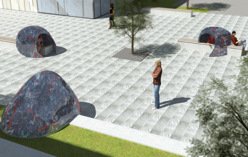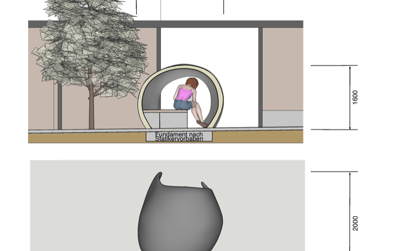 Der Entwurf für die sieht die Herstellung dreier, an die Umgebung angepasster, blasenförmiger Hohlkörper aus mehrfarbigem poliertem Epoxidharz vor, welche sich mit ihren konvex gewölbten Formen über Teilbereiche der geplanten Möblierung des Außenraumes legen. Dabei werden bestehende Sitzgelegenheiten integriert und als konzeptioneller Bestandteil der Kunst am Bau genutzt. So bilden die Schutzblasen begehbare Innenräume, die sich über eine Öffnung betreten lassen. Jede der drei Blasen umschließt oder überwölbt einen Teil der geplanten Sitzmöbel und lädt dazu ein, sich niederzusetzen und den umgebenden Raum auf sich wirken zu lassen.