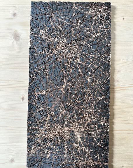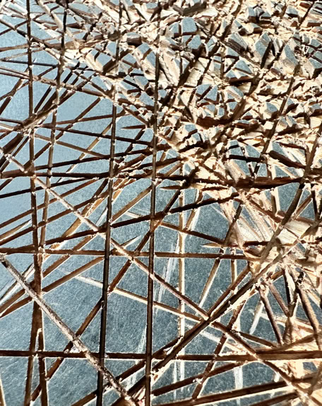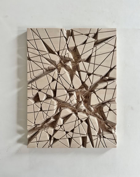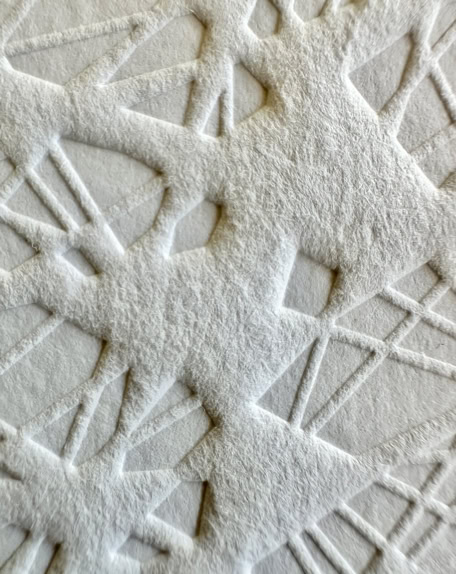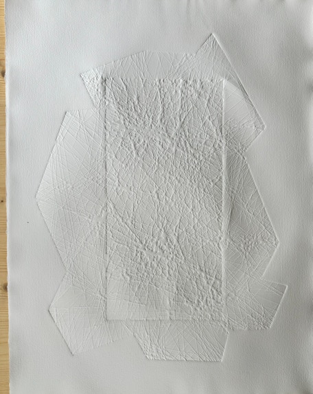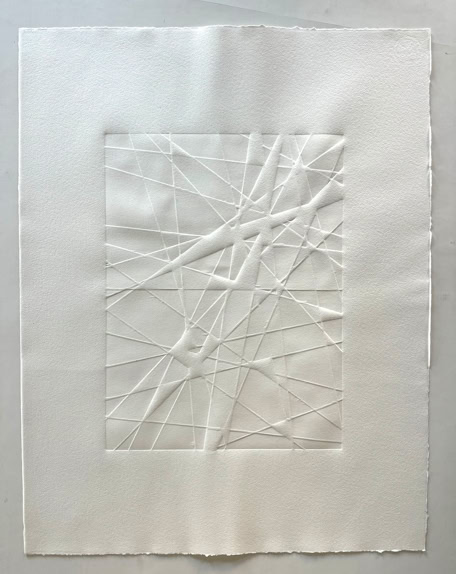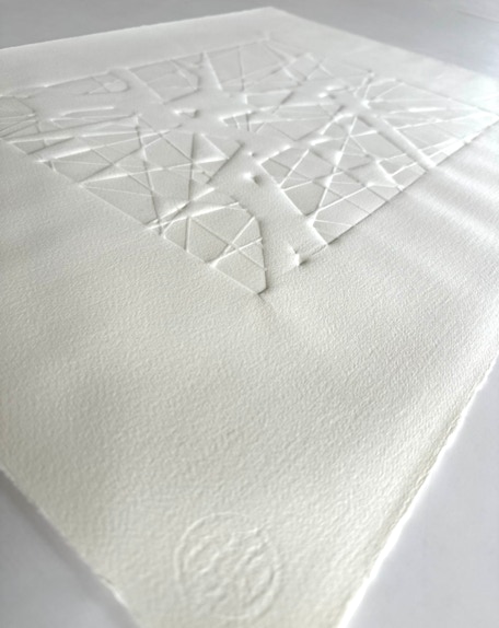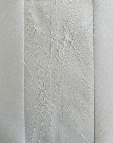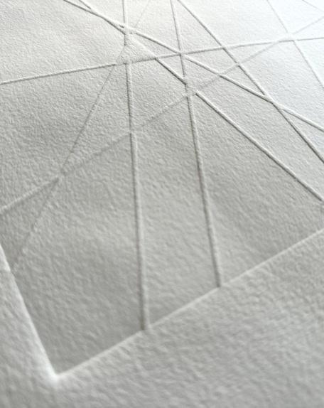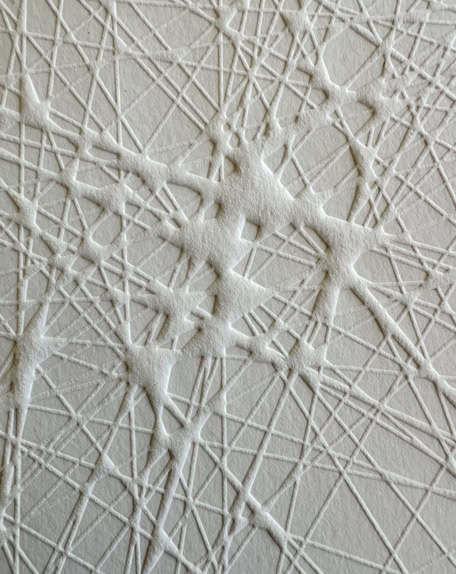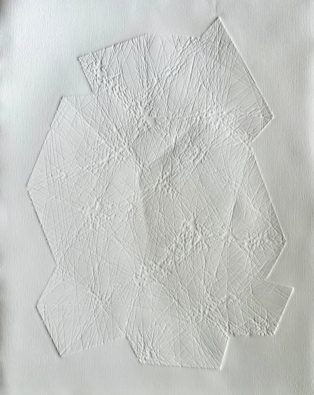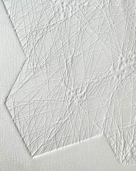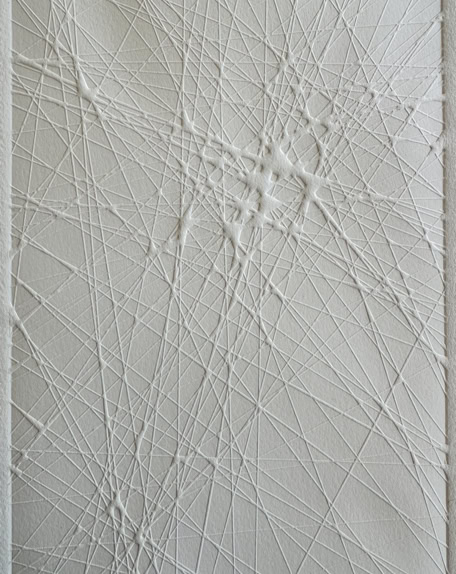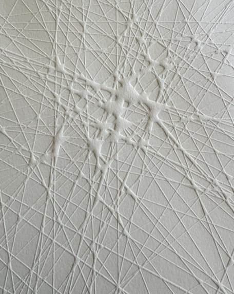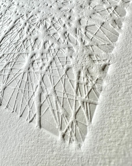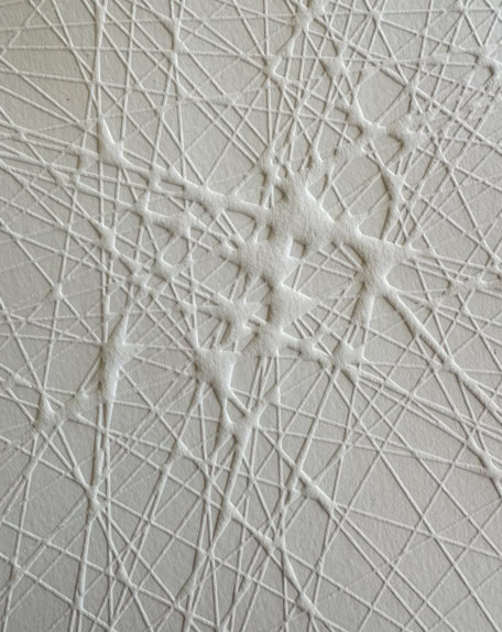 Mit hoher Druckkraft und ohne den Einsatz von Farbe in das Papier geprägt, entfaltet die Arbeit allein durch Licht und Schatten ihre räumliche Wirkung. Sie betont die sensible Dreidimensionalität des Materials und macht zugleich verborgene Ordnungen innerhalb des Fasergefüges sichtbar. PRÄGUNG ist eine abstrakte Kartografie von Informationsflüssen, Wachstumsprozessen und energetischen Verbindungen – und verweist auf universelle Prinzipien von Struktur, Kommunikation und Vernetzung in Natur und Technik. |