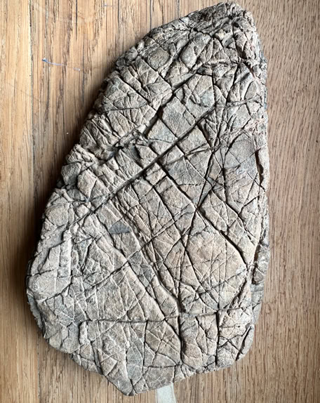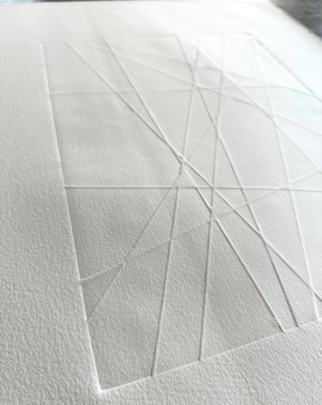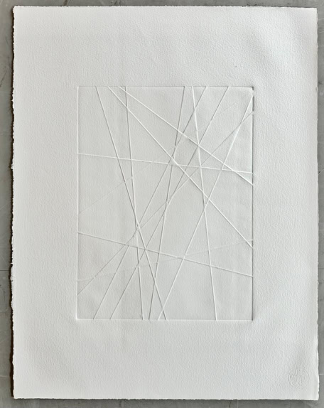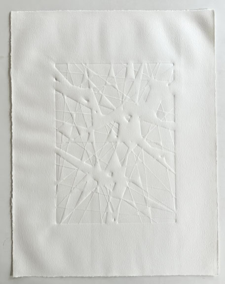 Diese Papierprägungen entstehen aus schrittweise weiterbearbeiteten Prägeplatten, deren glatte Oberfläche durch wiederholtes Einschneiden zunehmend verletzt wurde. Die entstandenen Schnittstellen verdichten sich zu gemeinsamen Ballungszentren.