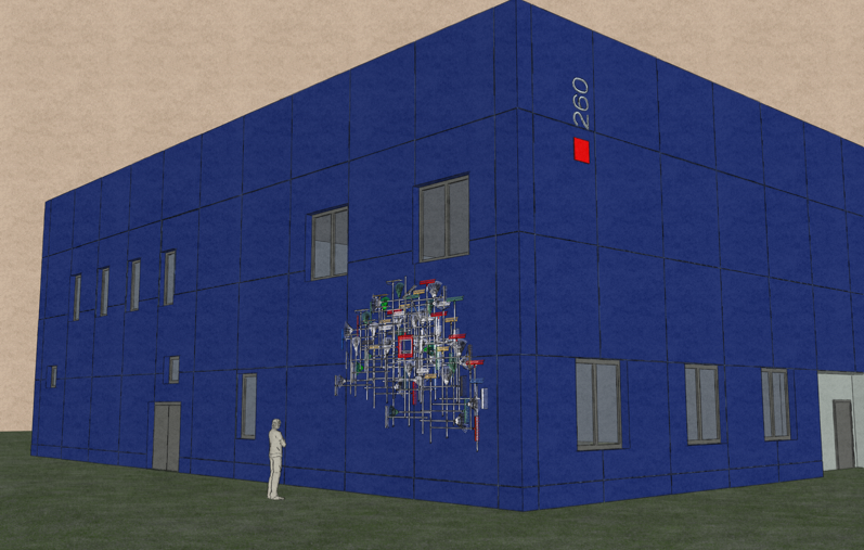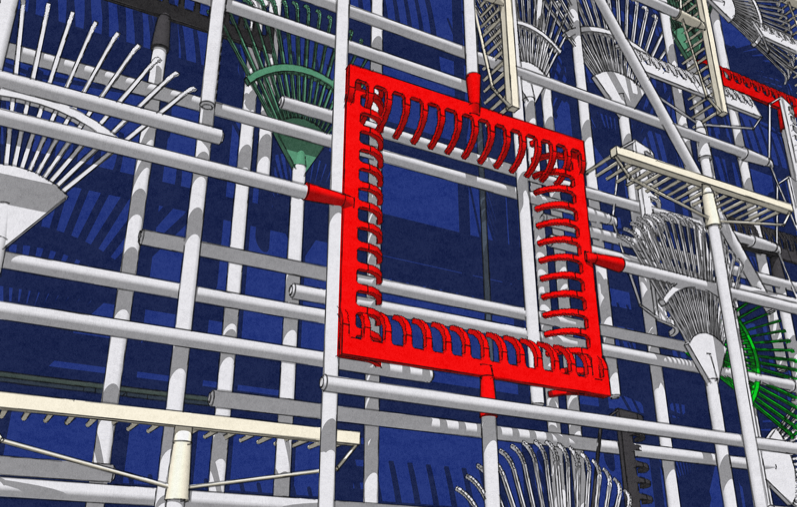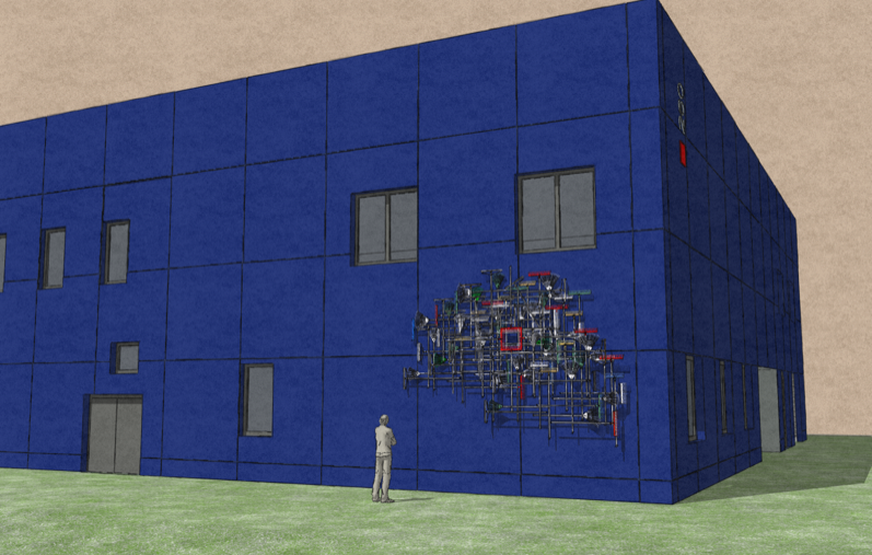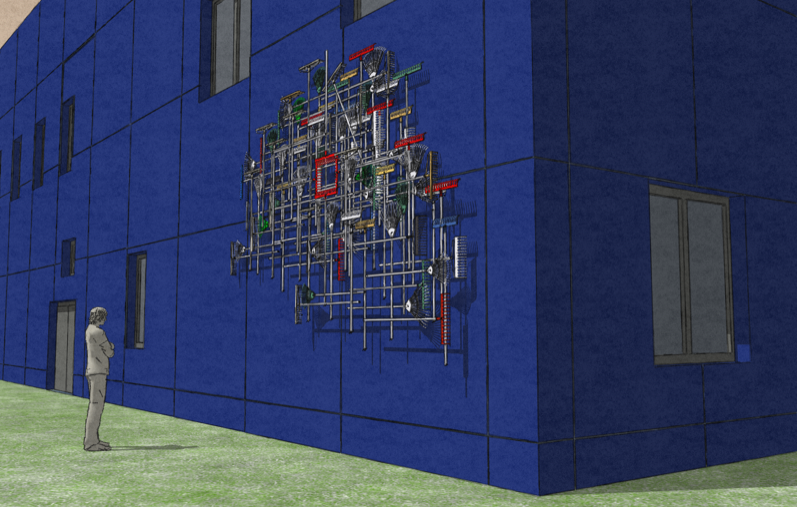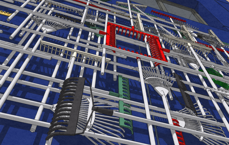 Countless metal gardening tools of different shapes and colors form a branched network that gathers around a center. This consists of 4 rakes turned at a 90° angle to each other and thus forming a square, which in this special arrangement is reminiscent of the structure of a processor - the heart of every computer. In this way, a humorous link to the building's purpose is created in a wondrous way, both visually and linguistically via the homonym.