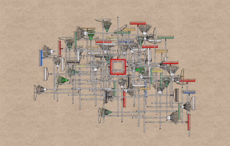 Die vielzähligen, sich miteinander kreuzenden Rechenstiele werden zu Verbindungen, Leitungen, Kabeln, Rohren, etc., so wie bei einem Objet trouvé – bei dem die „Verwandlung“ aus den bisherigen Funktionen und Bedeutungen zu neuen Zusammenhängen künstlerisch zelebriert wird. |