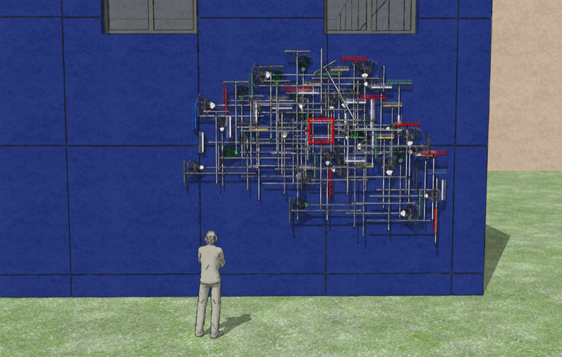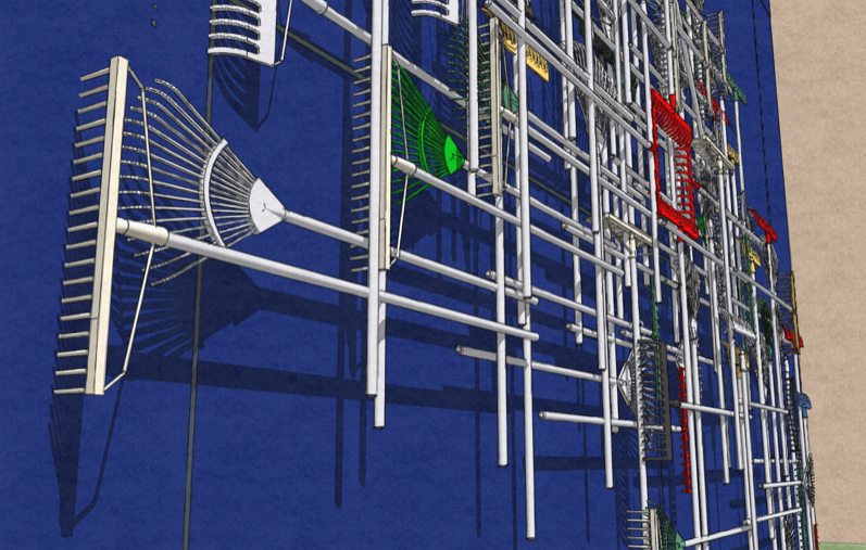 Unzählige Gartenbearbeitungsgeräte unterschiedlicher Gestalt und Farben aus Metall, bilden ein verzweigtes Geflecht, welches sich um ein Zentrum versammelt. Dieses besteht aus 4 im 90° Winkel zueinander gedrehter und so ein Quadrat bildender Rechen, welche in dieser speziellen Anordnung an die Struktur eines Prozessors erinnert - das Herzstück eines jeden Computers. So entsteht auf wundersame Weise bildnerisch-formal und zugleich sprachlich über das Homonym, eine humoristische Verknüpfung zur Gebäudebestimmung.