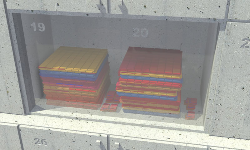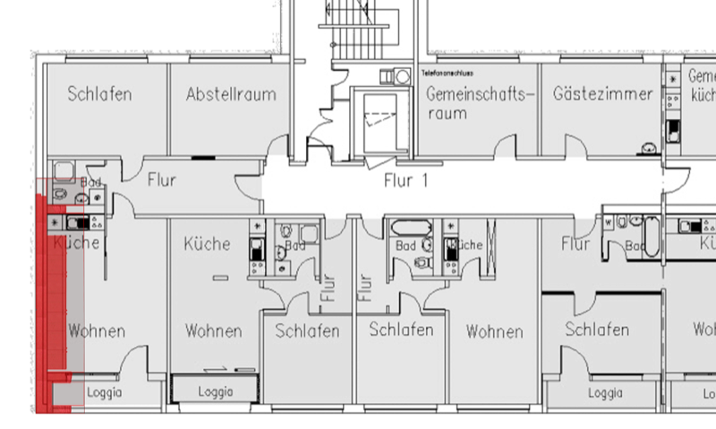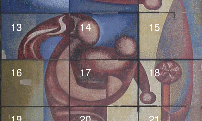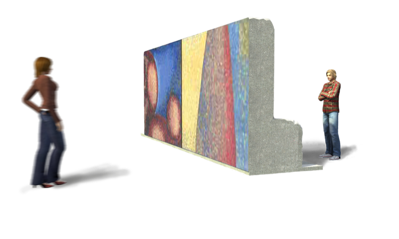 Zwei benachbarte Platten, die in Ihrem Zustand am besten erhalten sind, sollen dafür im Original bestehen bleiben und gefestig, bzw. konserviert werden. Alle anderen 28 Tafeln werden von Ihren Trägerplatten abgelöst, nach einer Kartierung in Einzelsegmente zerlegt und am selben Ort auf der Rückseite der zwei Originalplatten, innerhalb einer nachgebauten 70er Jahre DDR-Schrankwand eingelagert.