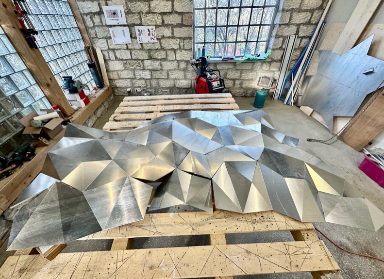 The triangular arrangements reproduce the surface movement of a particular landscape. In a reduced way, they form the topographical modelling of the surrounding mountains and thus establish a connection to the location of the educational centre and the adjacent forested area, which is strongly influenced by its geographical setting. With the poetic image of a floating leaf, the sculpture also refers to the transfer and transmission of information that takes place here.
