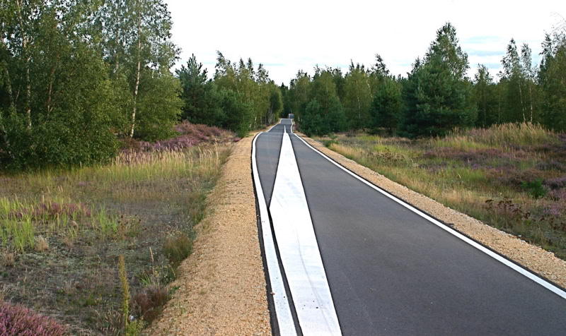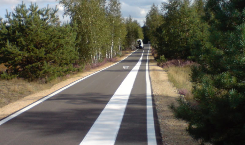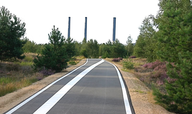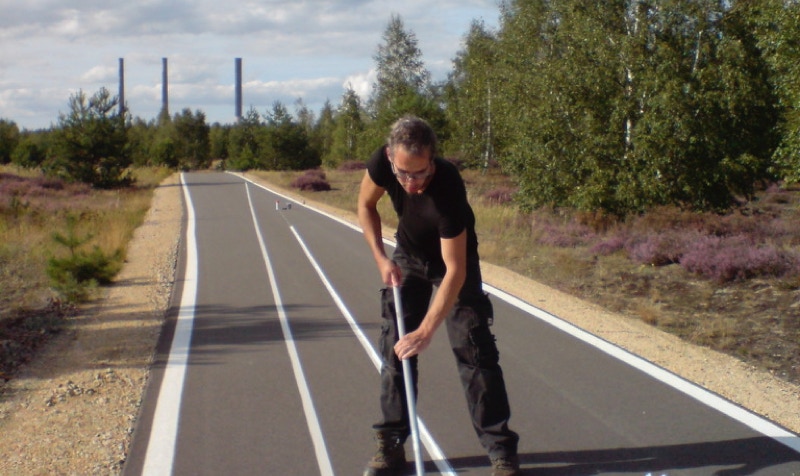 Vertikale verlängert die in den Himmel ragende Linie eines monumentalen Schornsteines vertikal in den umgebenden Landschaftsraum. Der aus weißer Dispersionsfarbe auf den Asphalt gemalte Strich erhält nur aus einer Blickrichtung seine „verlängernde“ Wirkung und gleichbleibende Linienstärke.