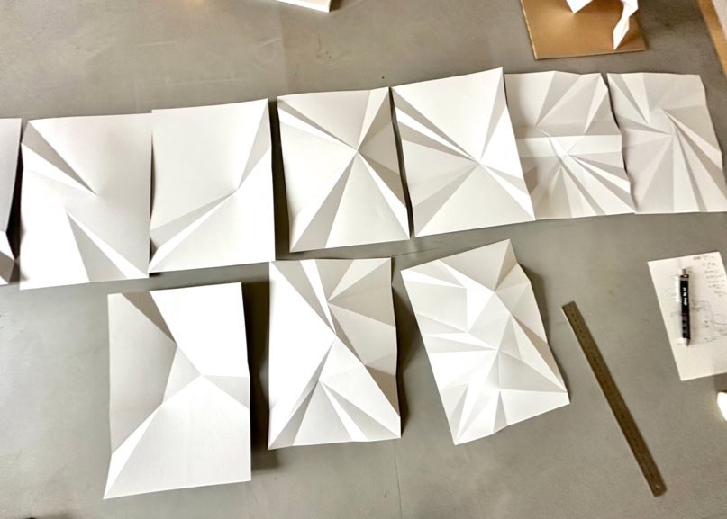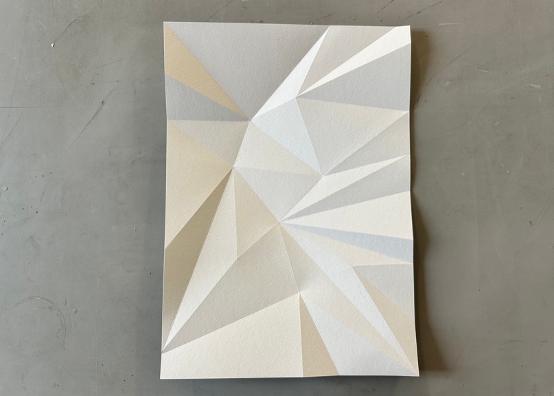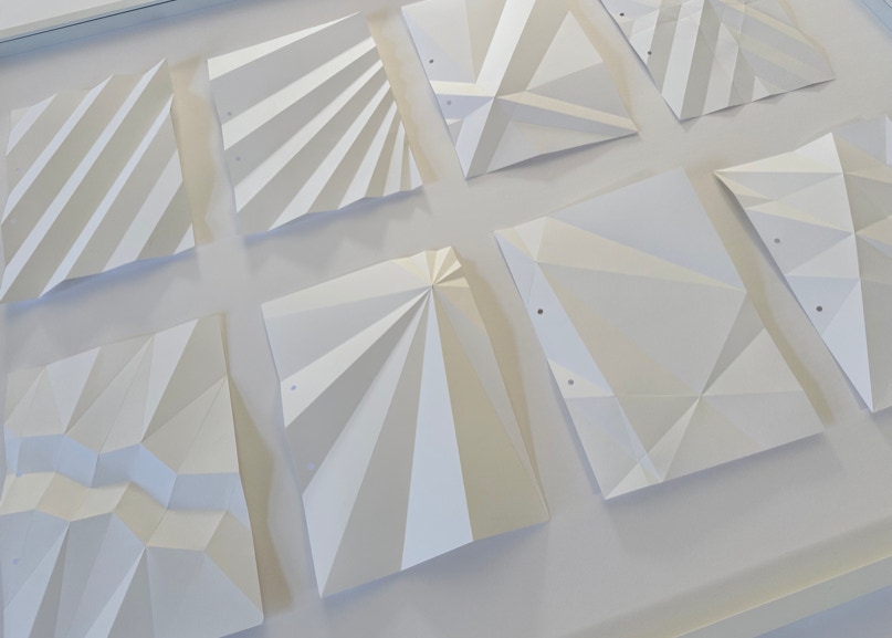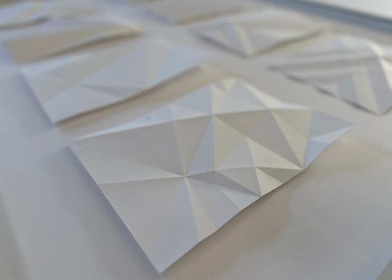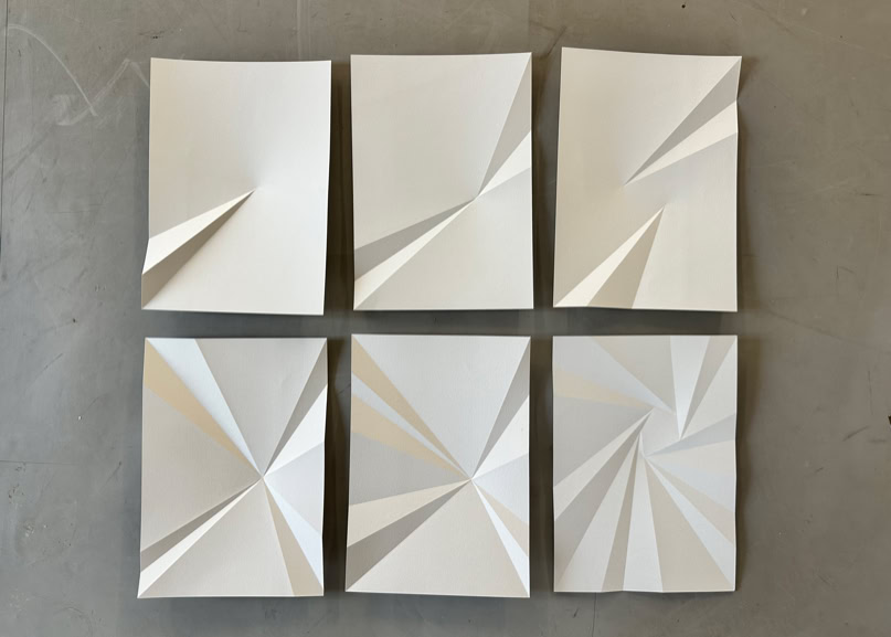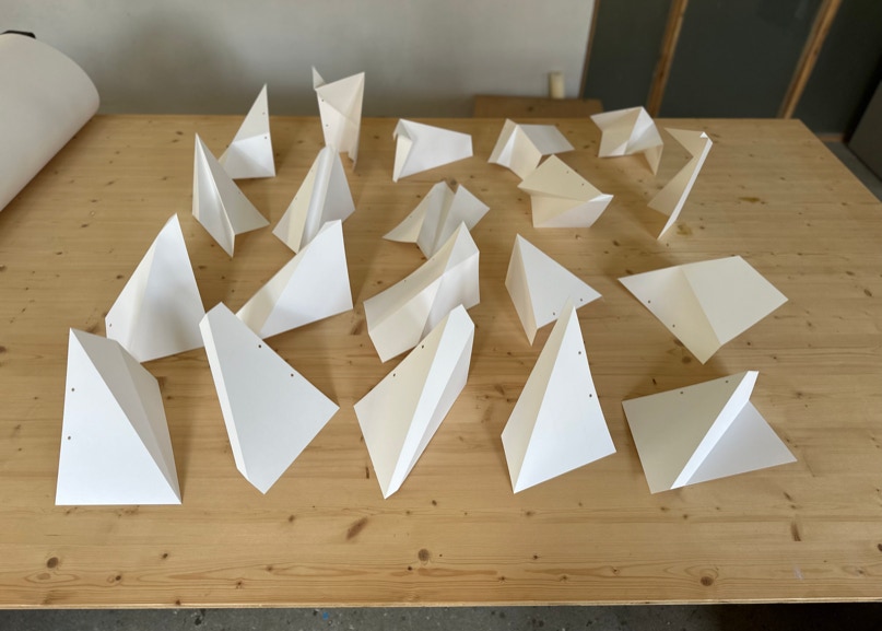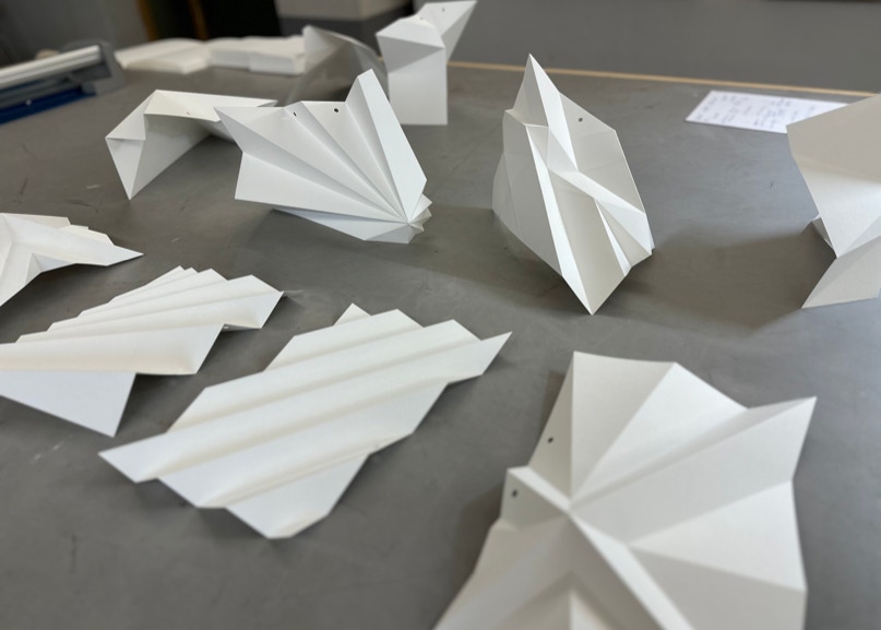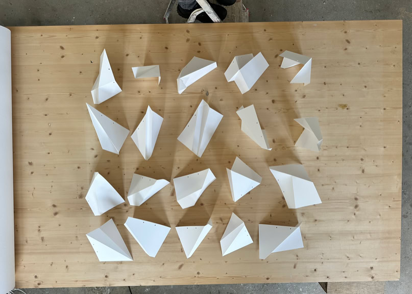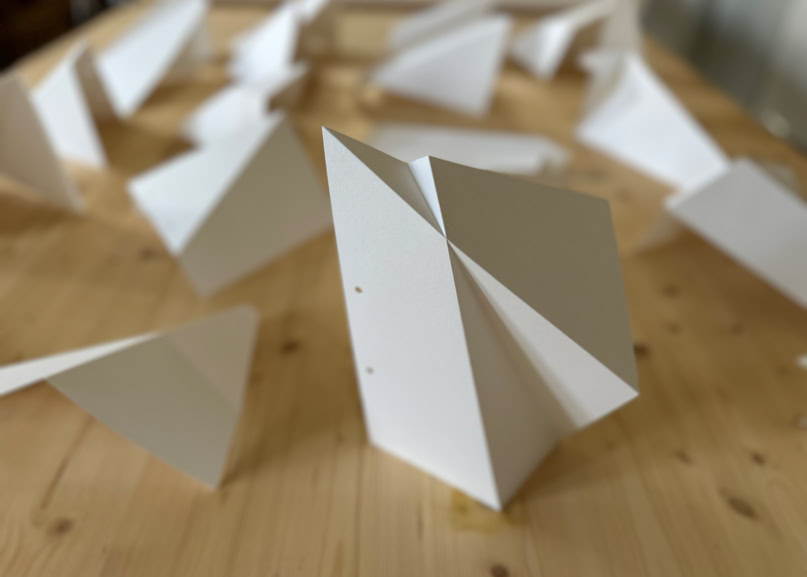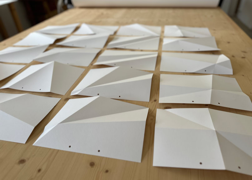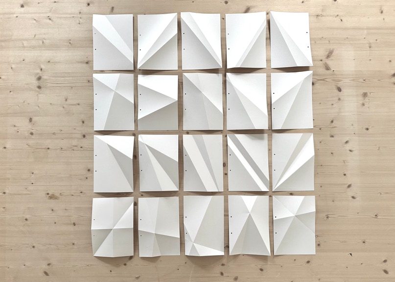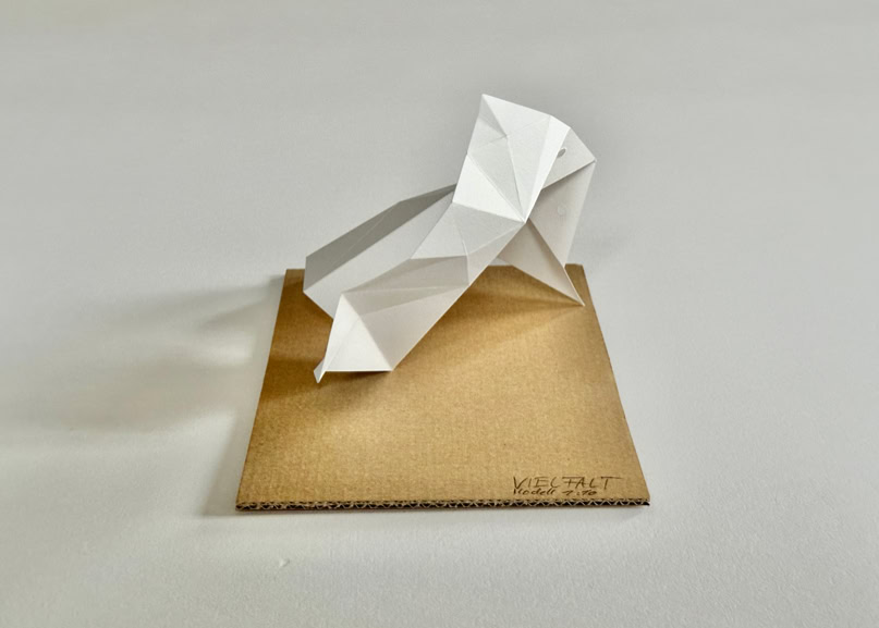 EINFALT and VIELFALT are the results of a previous experimental arrangement with a large number of folded A4 sheets, which become spatial objects with geometric and static properties through their folding. With each additional fold, the possibilities of the surfaces and edges spreading out in space increase.