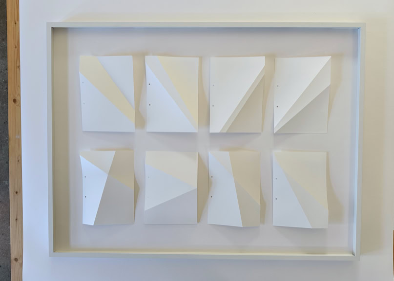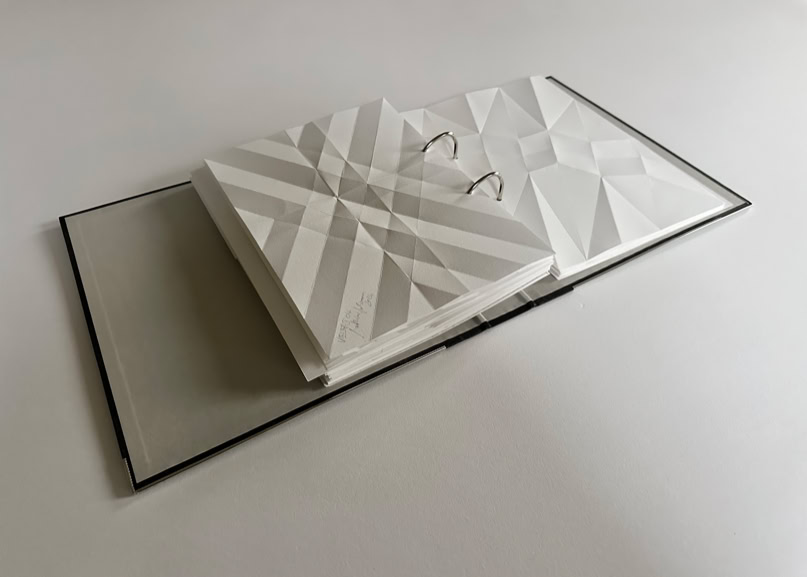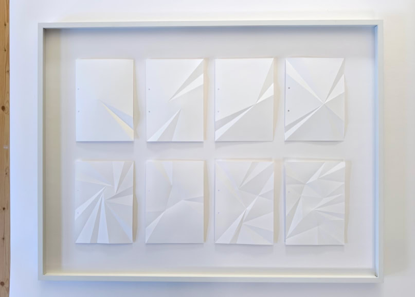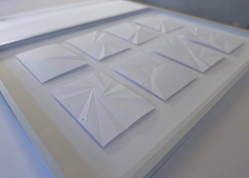 EINFALT und VIELFALT sind die Ergebnisse einer vorangegangenen Versuchsanordnung mit einer Vielzahl gefalteter A4-Blätter, die durch ihre Faltung zu räumlichen Objekten mit geometrischen und statischen Eigenschaften werden. Mit jeder zusätzlichen Faltung potenzieren sich die Möglichkeiten der sich im Raum ausbreitenden Flächen und Kanten.