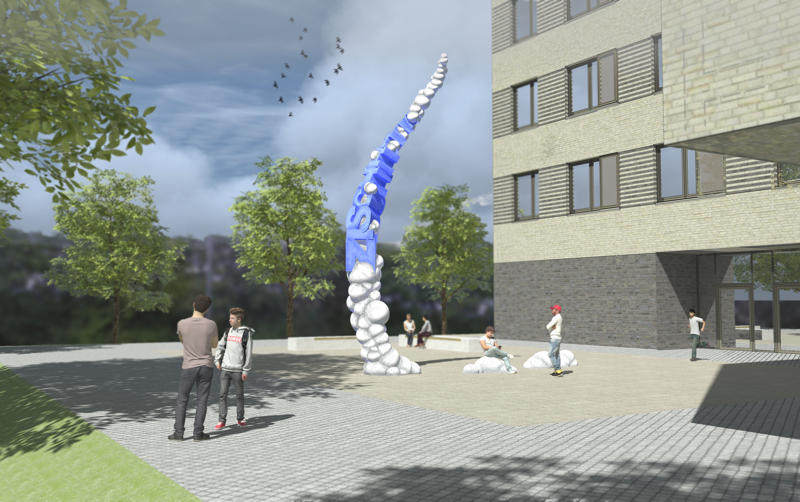 Einem Comic gleich eröffnet die skulpturale Anordnung ein erzählerisches Moment einer Geschichte, deren Anfang und Ende für jeden offen bleibt und nach Belieben weitergesponnen werden kann. Eins jedoch kann mit relativer Sicherheit behauptet werden: Der Held dieser Geschichte scheint direkt aus dem Schulgebäude des Gymnasium Dresden Klotzsche gekommen zu sein.
