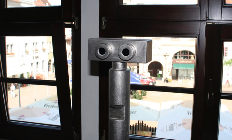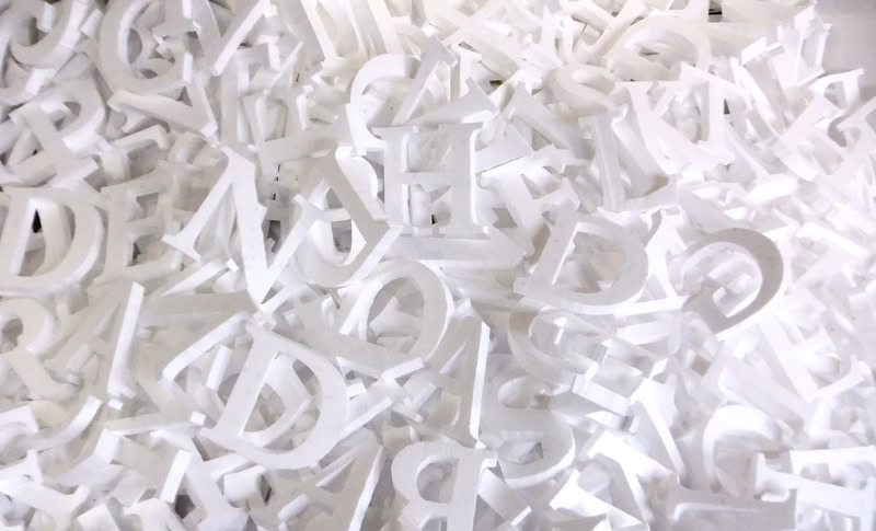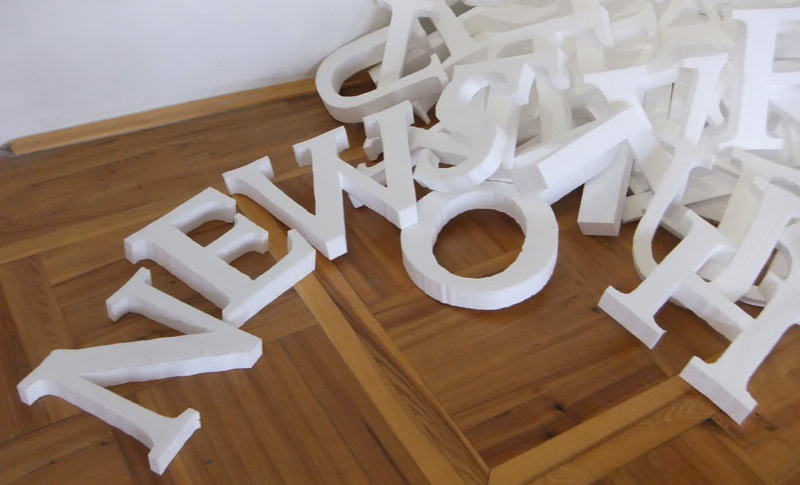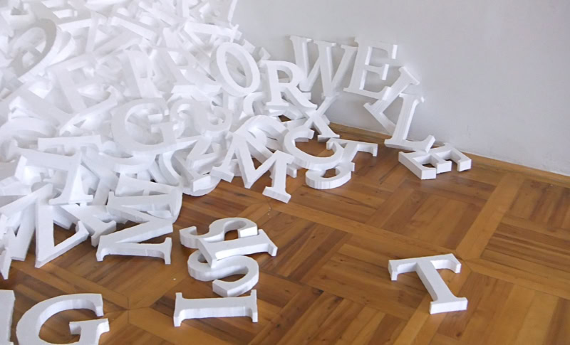Wird der Raum nun durch hunderte von weißen Buchstaben verdrängt, ist dies zunächst auch eine ungewohnte Ansicht. Buchstaben die uns in Ihrer Schriftart an Lettern der Zeitungspresse erinnern, stapeln sich bis fast unter die Decke, bilden Worte und Wortfetzen, fließen an der Wand und auf dem Boden weiter und scheinen sich auch auf den Außenraum zu ergießen, glaubt man dem Blick durch das Fernglas am Fenster. Eine Flut von Buchstaben, Worten und Wortfetzen, die den gewohnten Lebensraum verdrängt, sich ausbreitet und in ihrer Konsequenz ebenso bedrohlich wird, wie ausuferndes Wasser.