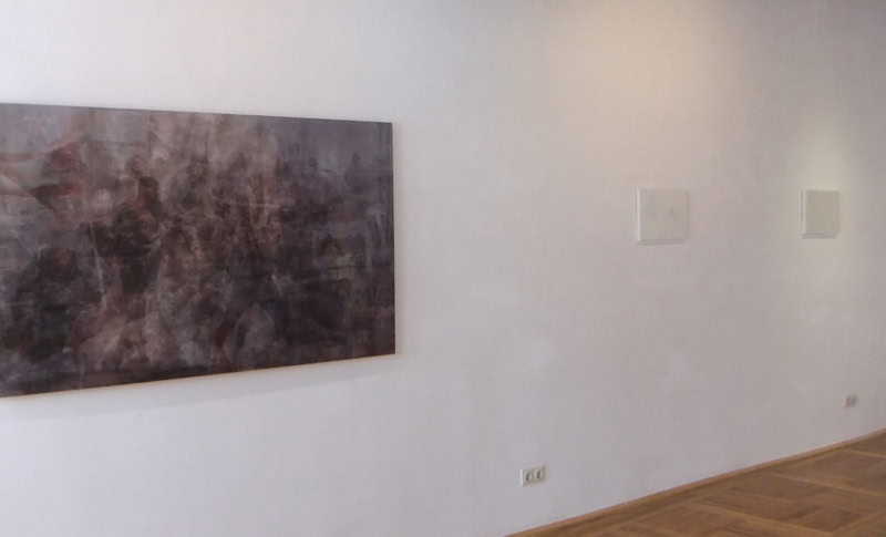 News 28.05.2015 ist der Titel des großformatigen Druckes links der Buchstaben-Installation. Für die Entstehung der Arbeit wurden an die 30 Bilder verschiedener Nachrichtenportale aus dem Internet, die an diesem Tag veröffentlicht wurden, übereinander gelegt. Das Ergebnis ist ein beeindruckendes Durcheinander von fragmentarisch hervorscheinenden Gesichtern, Händen, Flaggen, Gewehren, Autokarossen, etc.. Dabei tendiert die Gesamtfarbigkeit des Bildes bei zunehmender Anzahl der sich überlagernden Bilder gegen Grau. Die verschiedenen Farbtöne heben sich gegenseitig auf und es entsteht ein interessanter Gegensatz zwischen dem Formchaos und den zurückgenommenen Grautönen.