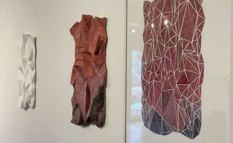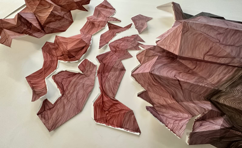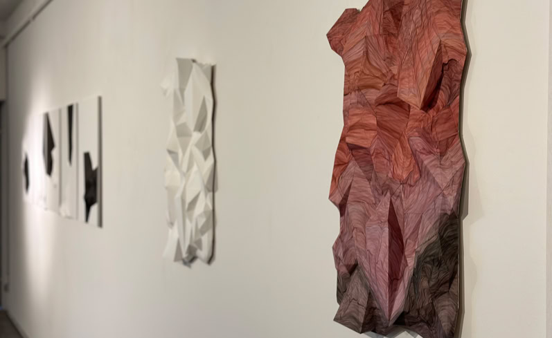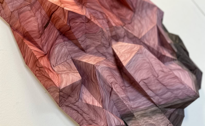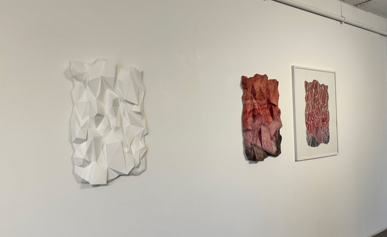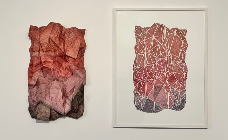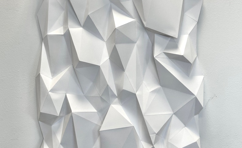 The CRASH series, consisting of three works, manifests itself in interlaced and disjointed triangular formations made of and on paper, which at times actually reach into the space, at times detail the spatial through graphic overpainting and add a further mapping, as in a virtual environment, or allow it to exist as an illusion on the two-dimensionality of the sheet.