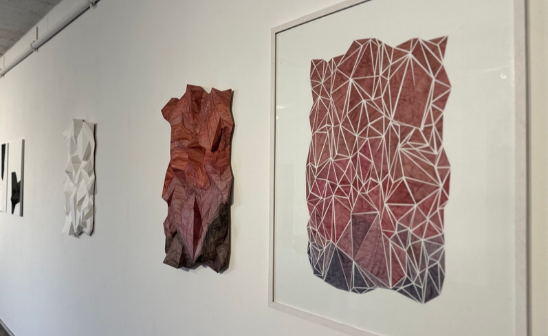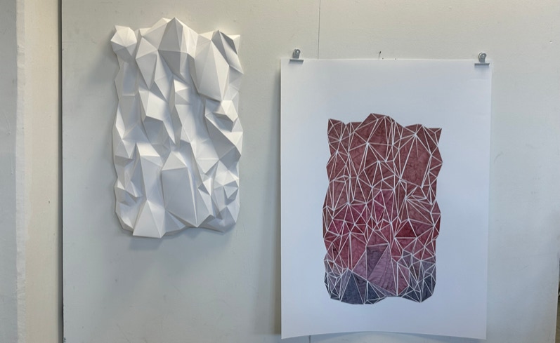 Die aus drei Arbeiten bestehende Serie CRASH manifestiert sich in verschachtelten und zerworfenen Dreiecksformationen aus und auf Papier, die einmal real in den Raum greifen, einmal das räumliche durch grafische Übermalung detaillieren und ein weiteres Mapping, wie in einer virtuellen Umgebung hinzufügen, oder es auf der Zweidimensionalität des Blattes als Illusion bestehen lassen. |