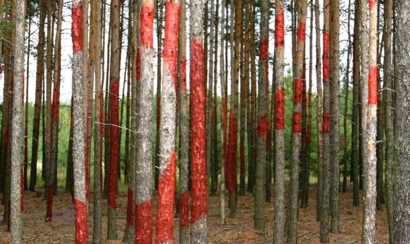 red paint on pine trunks, 50 x 60 x 100 m, transNATURALE 2007