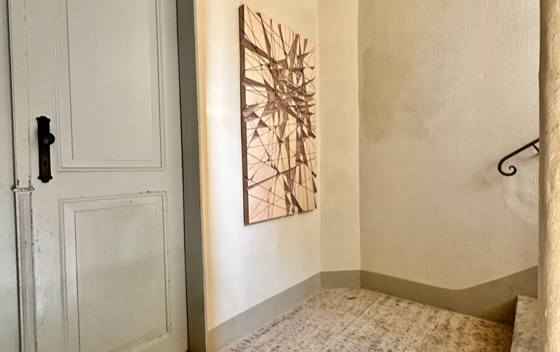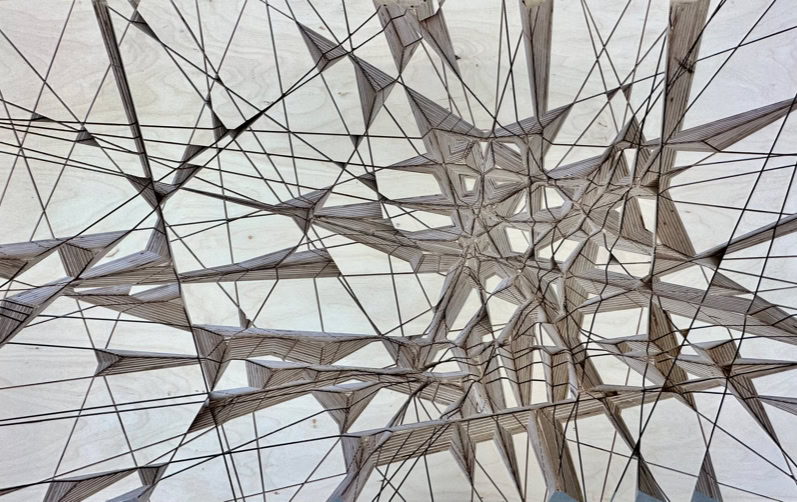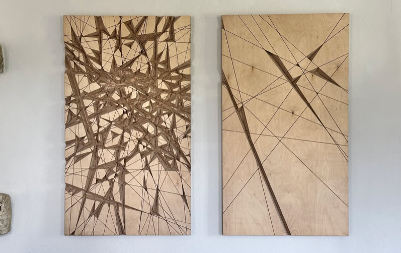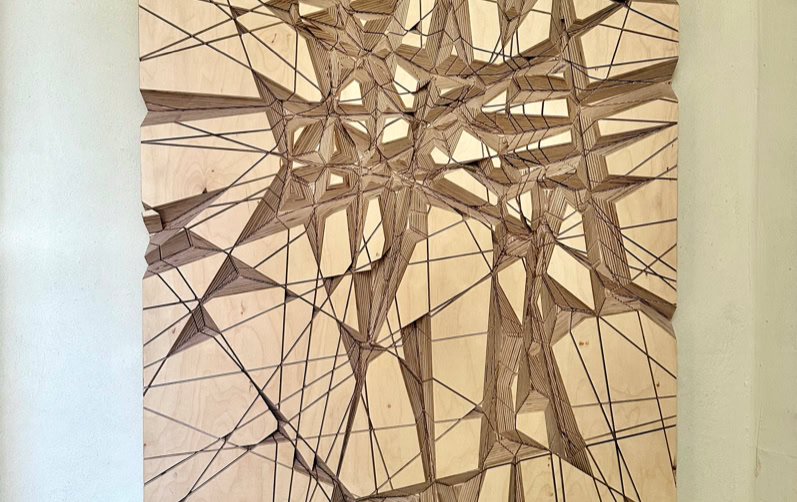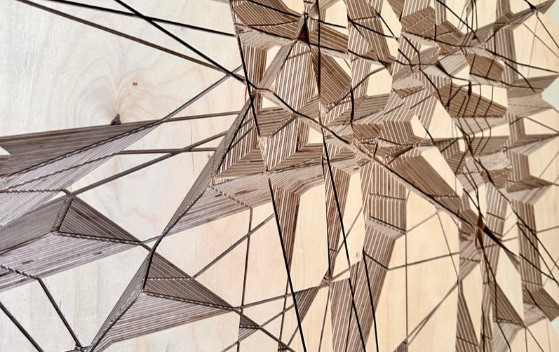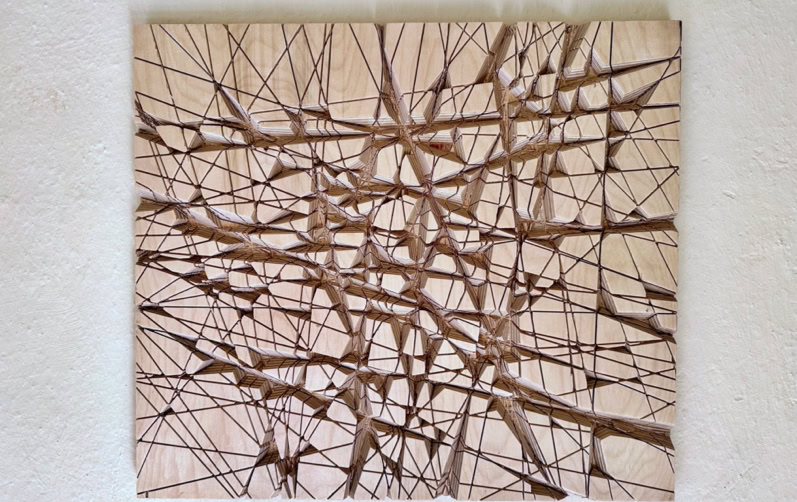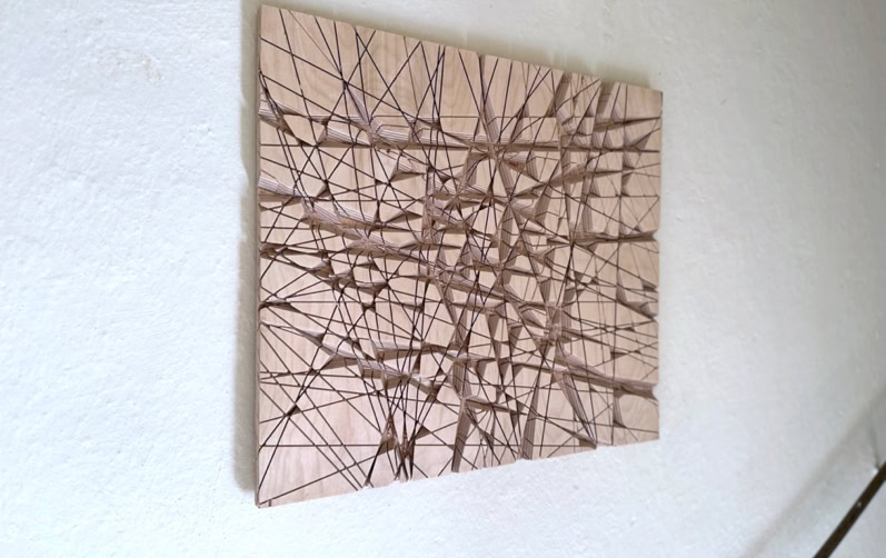 Sperrholzplatten verfügen aufgrund ihrer Herstellungsweise über einen geschichteten Aufbau, der bei der Oberflächenbearbeitung des Materials zum Vorschein kommt. Durch willkürlich angeordnete schräge Einschnitte entstehen nicht planbare Vertiefungen, die durch ihre Schichtungen an Bergbau oder perspektivisch verzerrte Straßenschluchten erinnern. |