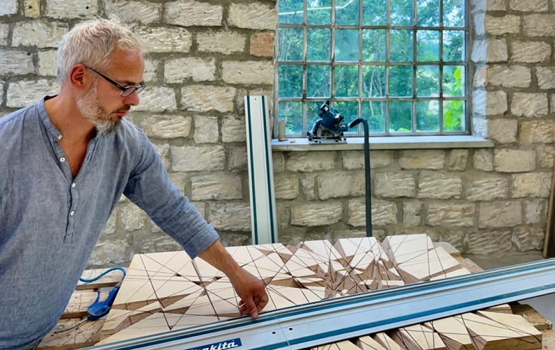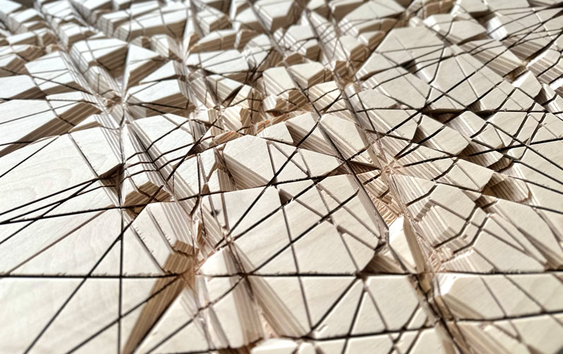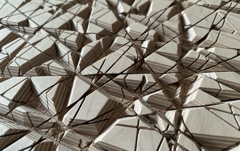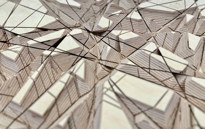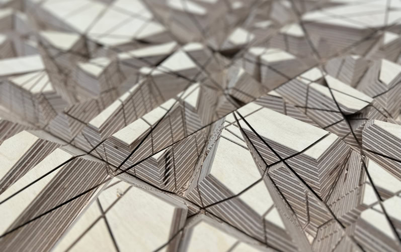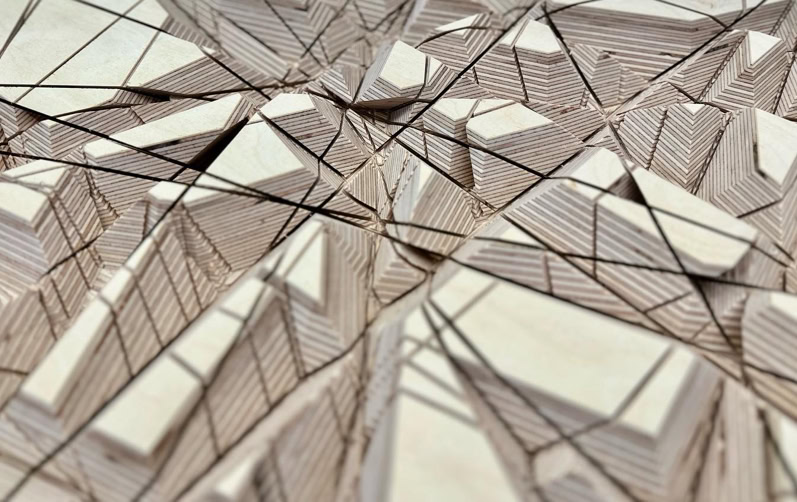 Due to the way they are manufactured, plywood panels have a layered structure that becomes apparent when the material is surface-treated. Randomly arranged diagonal incisions create unplannable depressions that are reminiscent of mining or street canyons distorted in perspective by their layering.