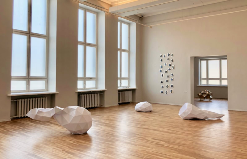 When a sculptor models a sculpture, there is often a lump of clay at the beginning that is gradually shaped into the desired form. Accordingly, in virtual 3D programmes, objects are modelled from a sphere. Entgleister Deltaeder 01-03 shows three objects modelled virtually at low resolution whose starting point was a sphere or a deltahedron. The objects, constructed from paper, represent various possibilities of spatial modification and deformation from their starting point. They show traces of virtual processing which were transferred into real space by transforming the geometric and cutting patterns of the objects.