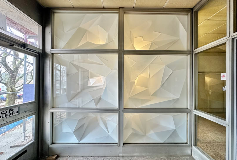 The term “DURCHWEG” encompasses meanings such as uniformity, consistency and continuity, but also refers to transitions, connections and directed movements. Geometrically shaped paper sculptures are inserted into the porter's lodge and respond to the formal rigor of the architectural grid. The structure, composed of triangular surfaces, plays with the limits of the space, with what is constructively feasible and combines static precision with a flowing, dynamic aesthetic.